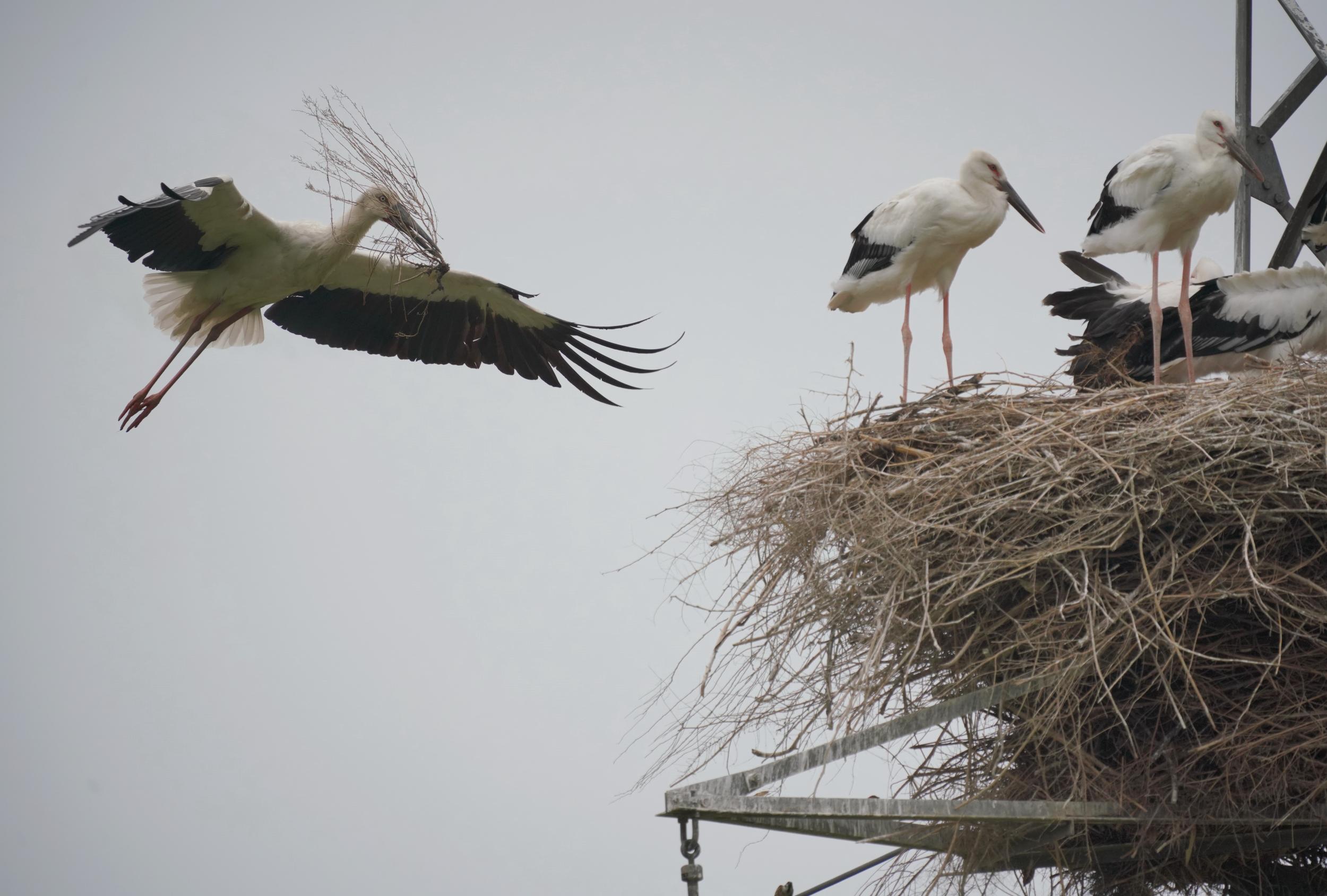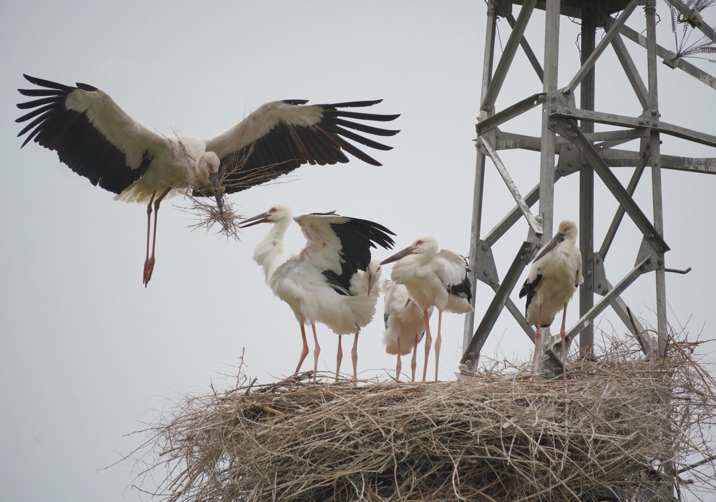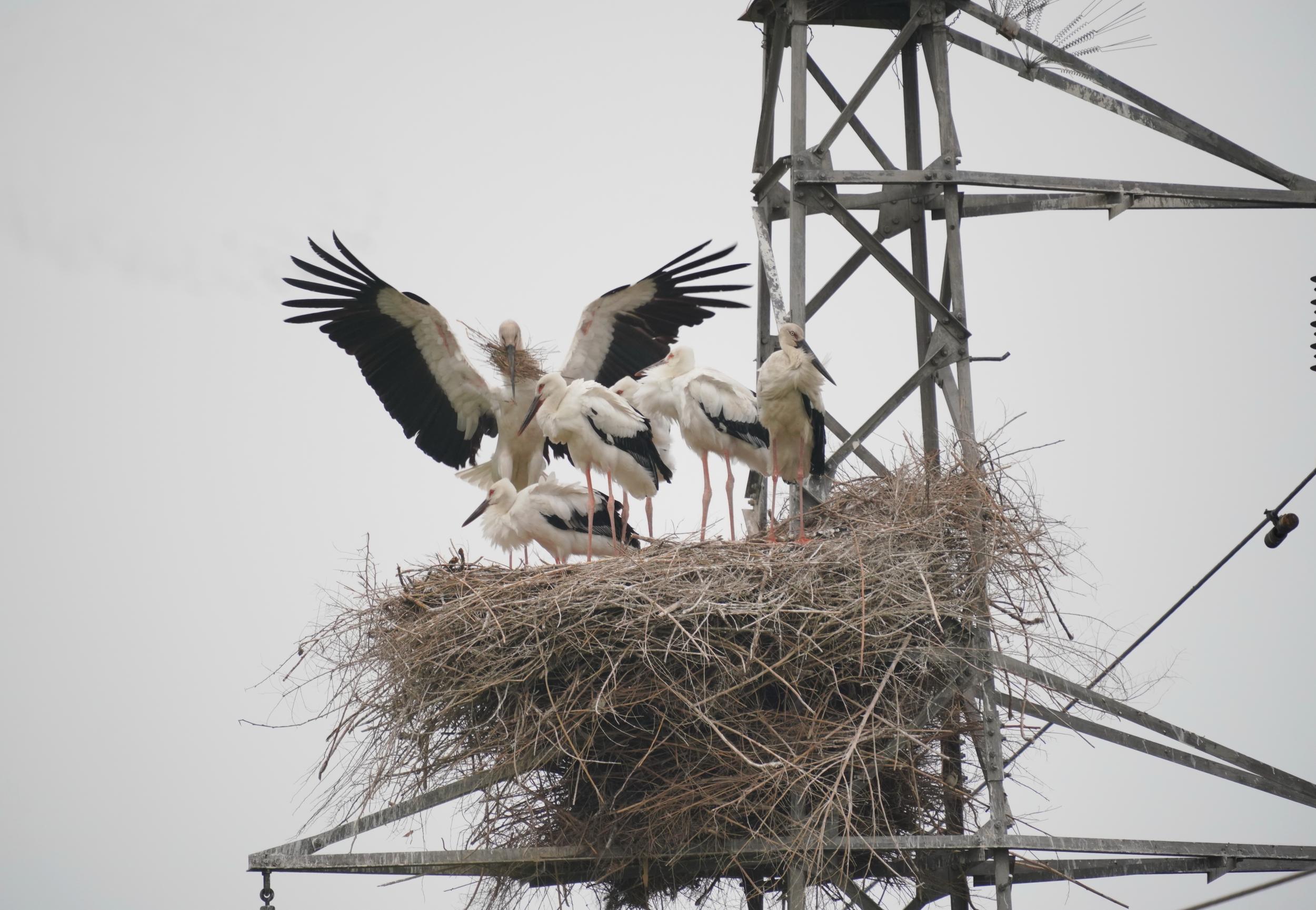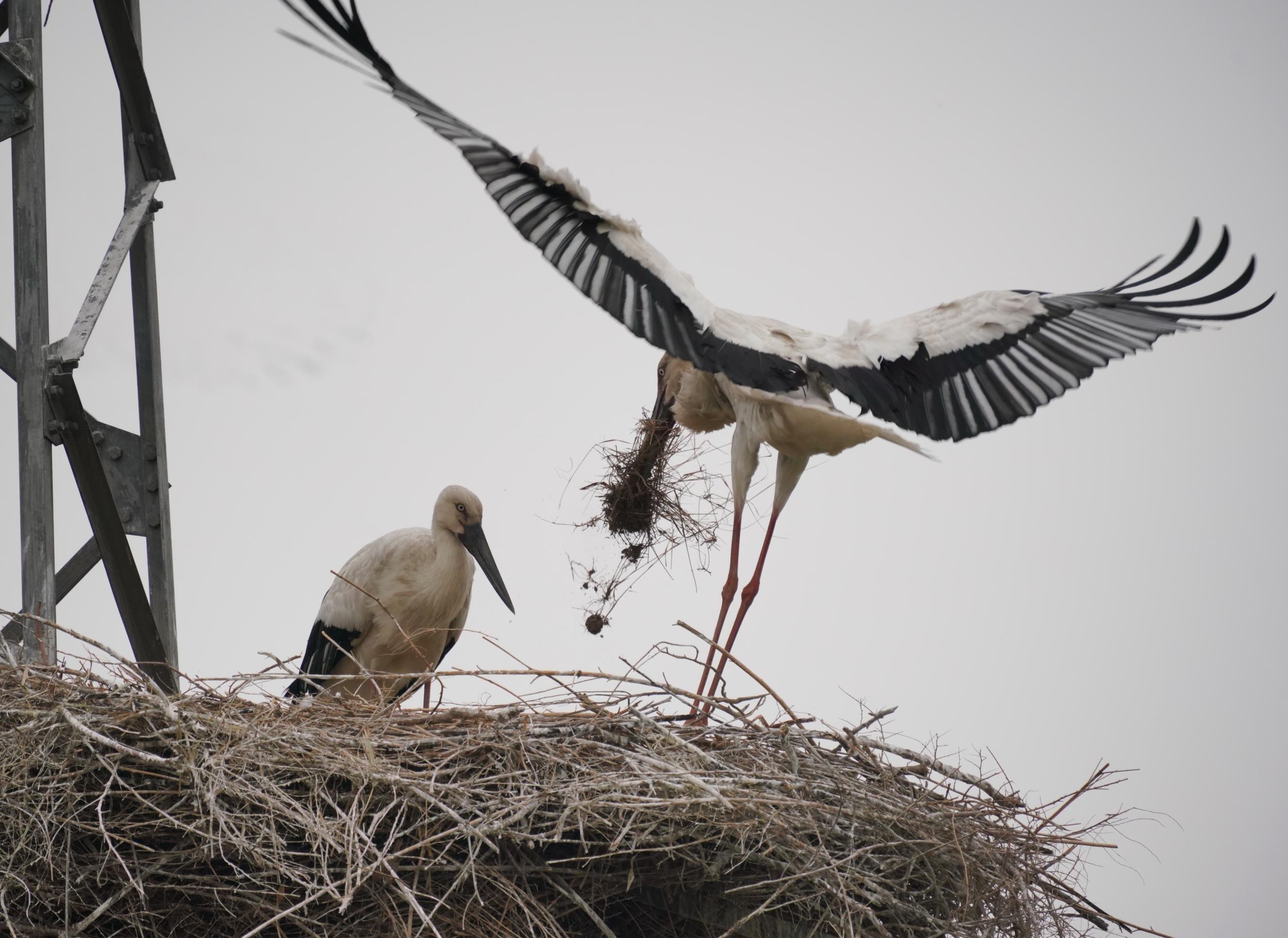 6月9日,东方白鹳成鸟在修护巢穴。新华社记者 杨世尧 摄
