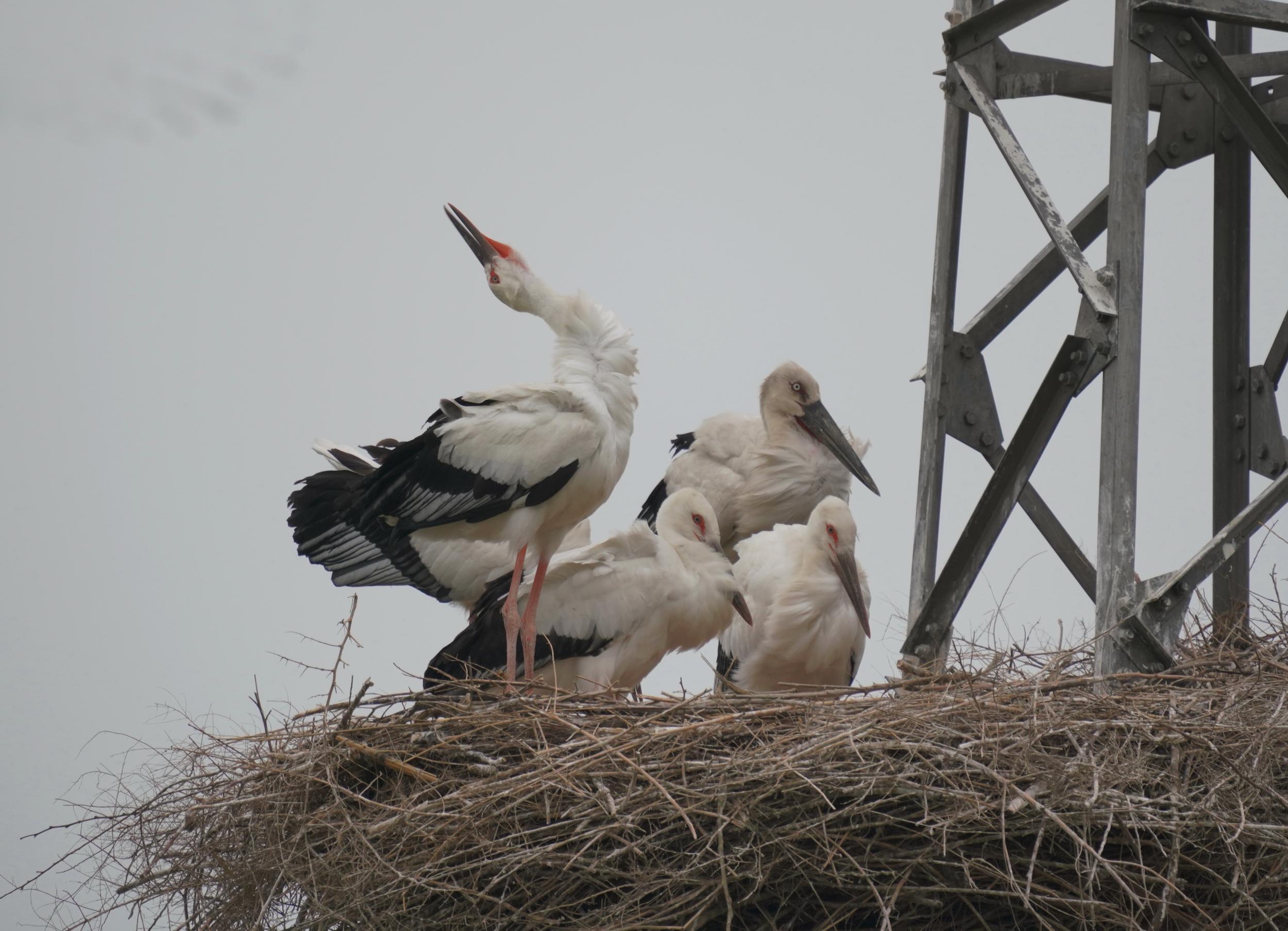 6月9日,一只东方白鹳成鸟(右后一)在巢中照顾雏鸟。新华社记者 杨世尧 摄