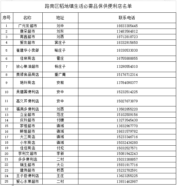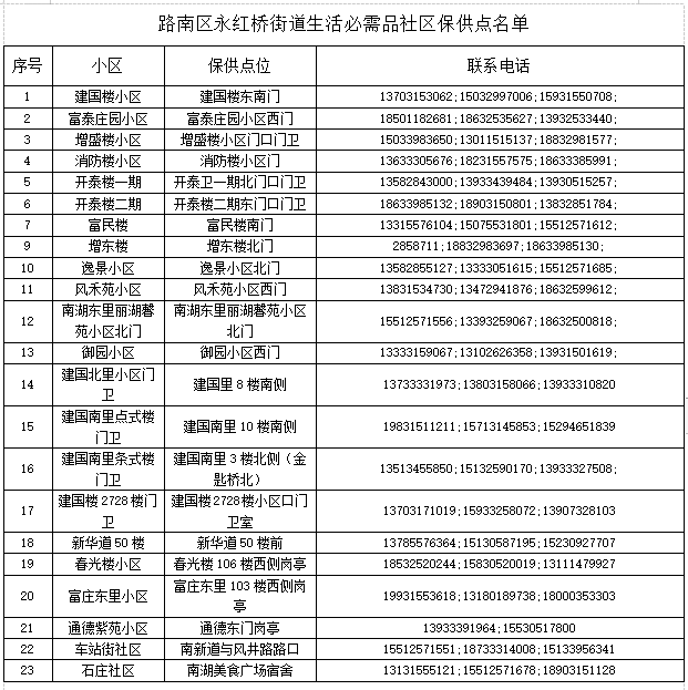 目前,全区各大批发市场、商超、粮油店、日用品店等保供企业日常生活物资储备充足,价格相对平稳,能够保证正常供应。请广大居民朋友及时联系对应保供点、保供便利店工作人员,理性消费,按需错峰采购。对有保供需要的企事业单位和个人,请及时与所在社区保供点联系人联系,或拨打下方公布的监督举报电话。市场监管、公安等部门已建立市场监督检查机制,对哄抬物价、囤积居奇等不法行为坚决严肃查处、严厉打击。(注:原3月25日发布的《路南区生活必需品保供公告(二)》废止,保供点位及联系电话已更新,请广大居民朋友相互转告。)
