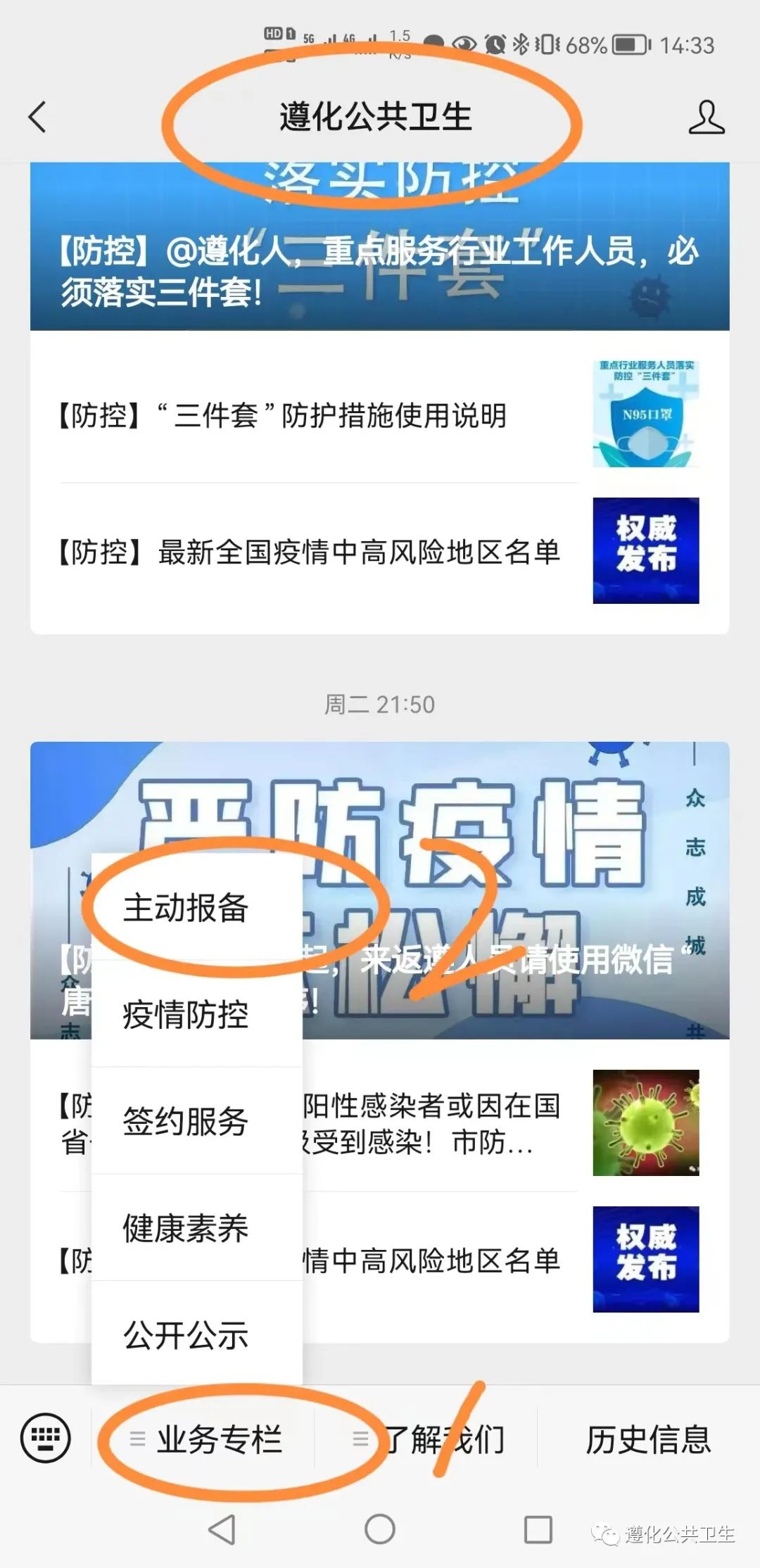 关注微信公众号【遵化公共卫生】点击左下角业务专栏~主动报备,打开填报页面。