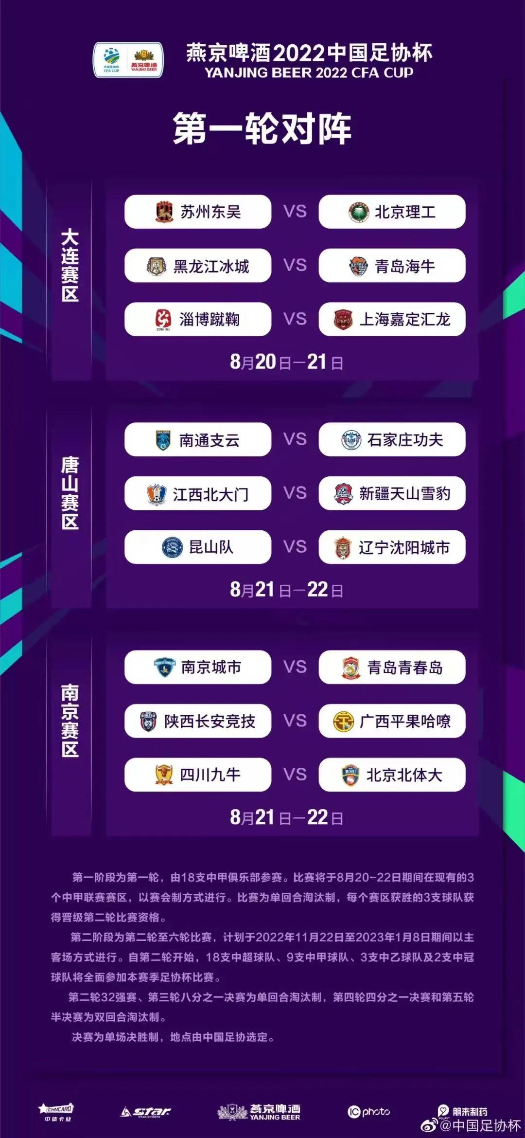 8月20-22日,在中甲联赛休赛之时,燕京啤酒2022中国足协杯第一阶段比赛将在南湖城市足球广场正式打响。来自中甲联赛的18支球队分别在唐山、大连、南京三个中甲联赛赛区进行单回合淘汰赛,胜出的9支队伍将晋级本赛季第二轮比赛。