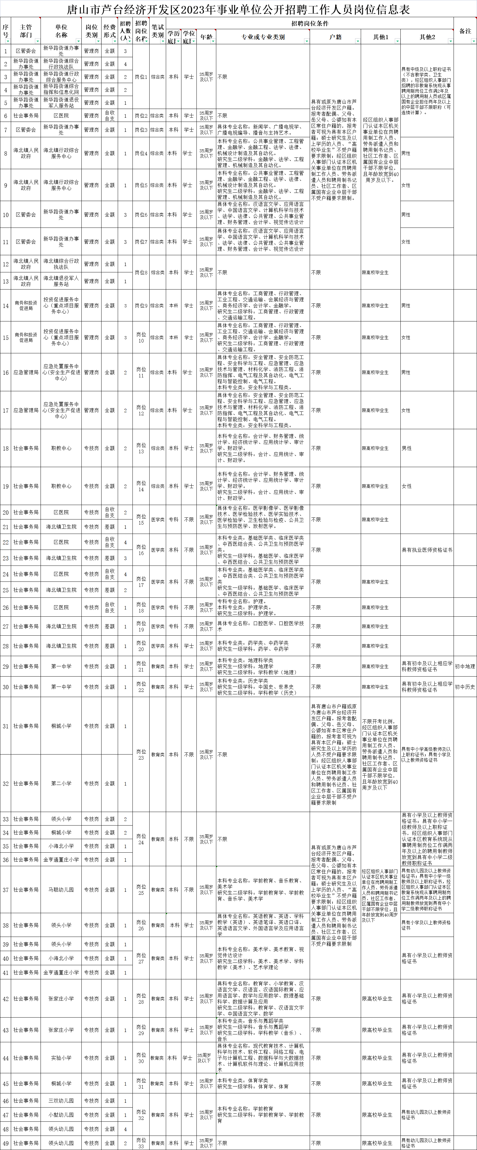 参加本次公开招聘的事业单位共招聘工作人员84名。各招聘单位的岗位、人数、岗位条件等详见《唐山市芦台经济开发区2023年事业单位公开招聘工作人员岗位信息表》(以下简称《岗位信息表》)。