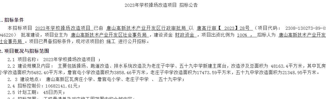 日前,中国河北网站发布《2023年学校操场改造项目招标公告》,详情如下: