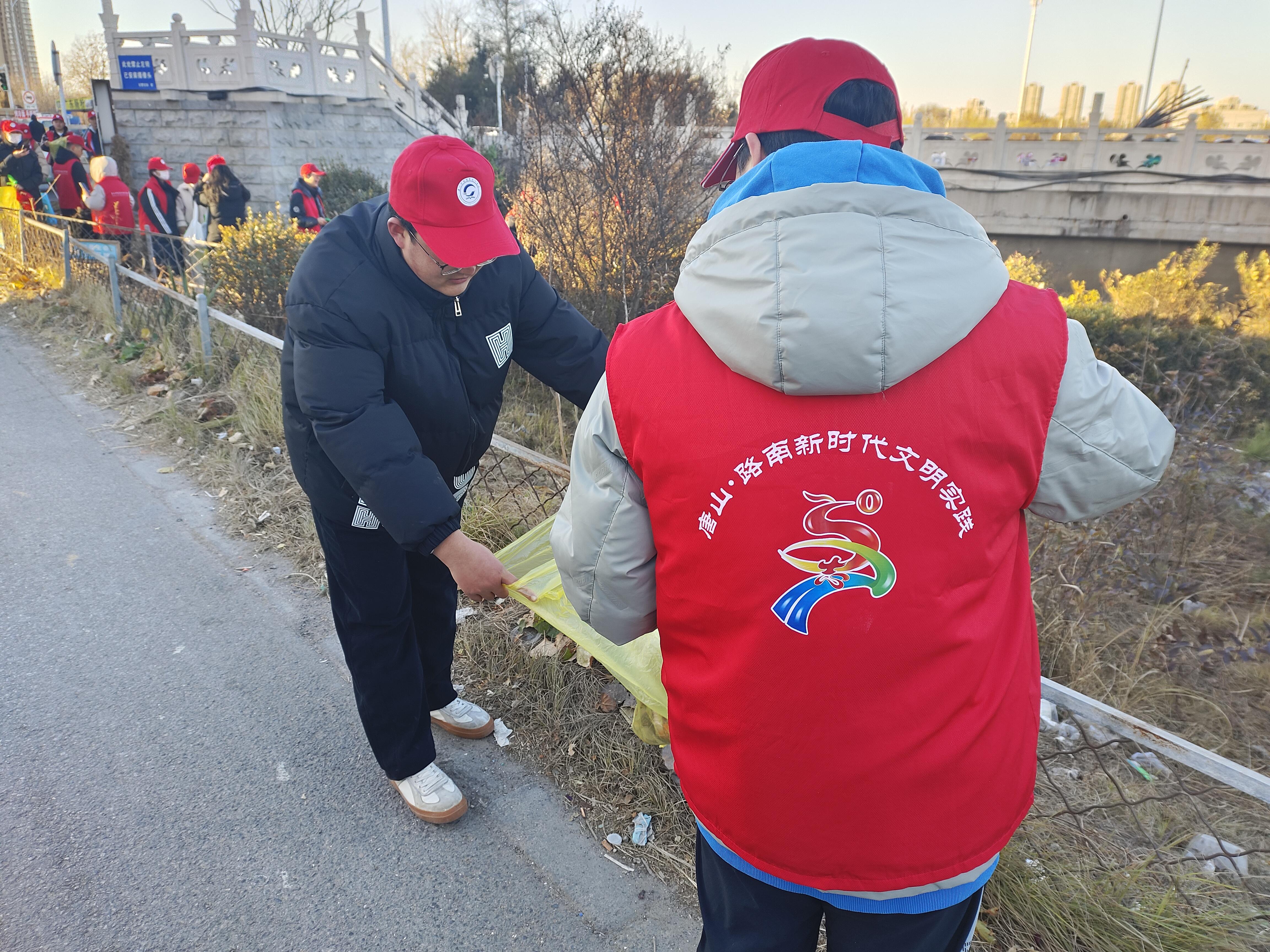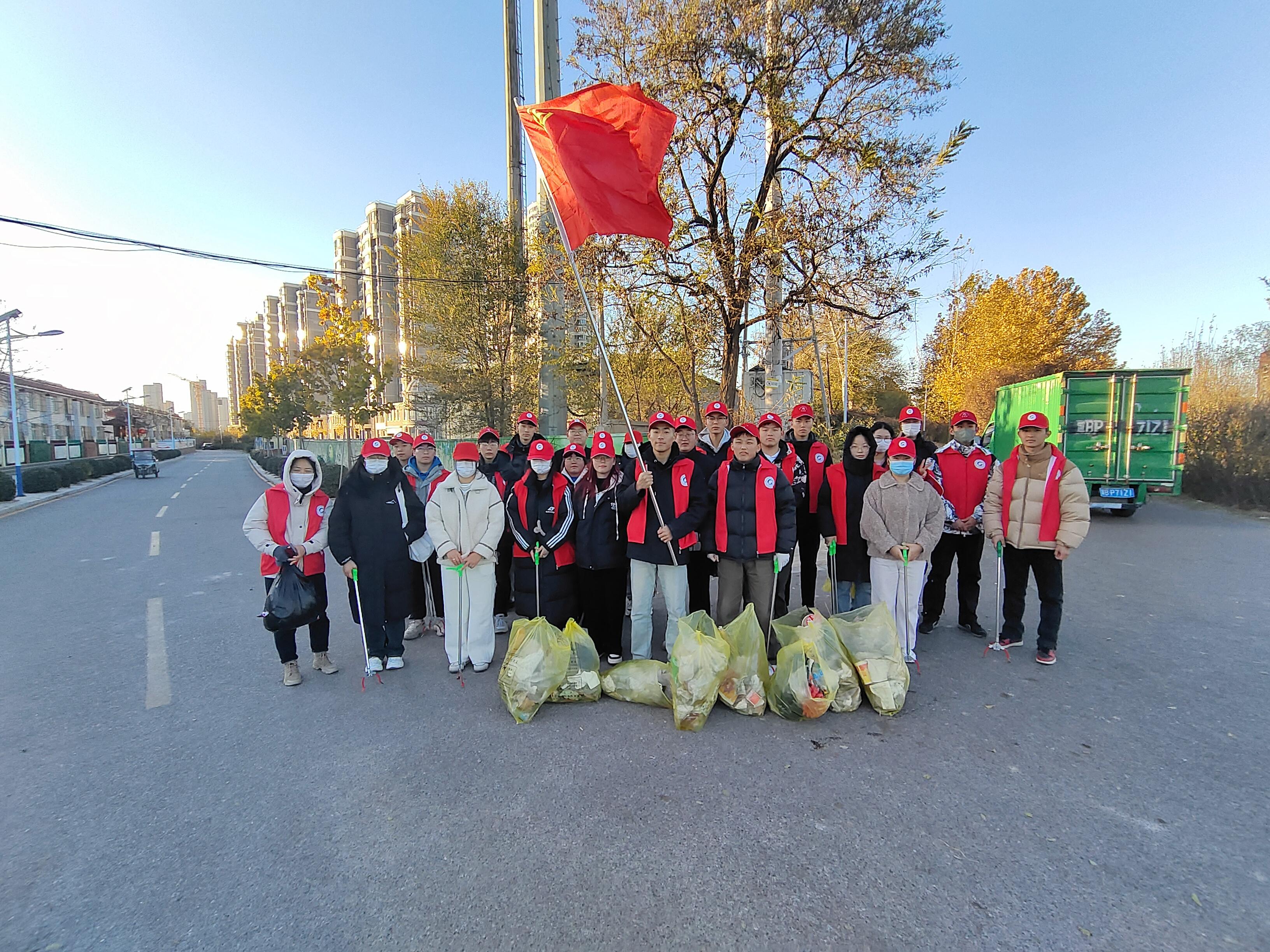 西越河村联合唐山科技职业技术学院的学生志愿者们共同开展了志愿服务活动。志愿者们在村干部的带领下,身穿红马甲,手拿垃圾夹和垃圾袋,沿着村内道路及唐河岸边弯腰捡拾垃圾。