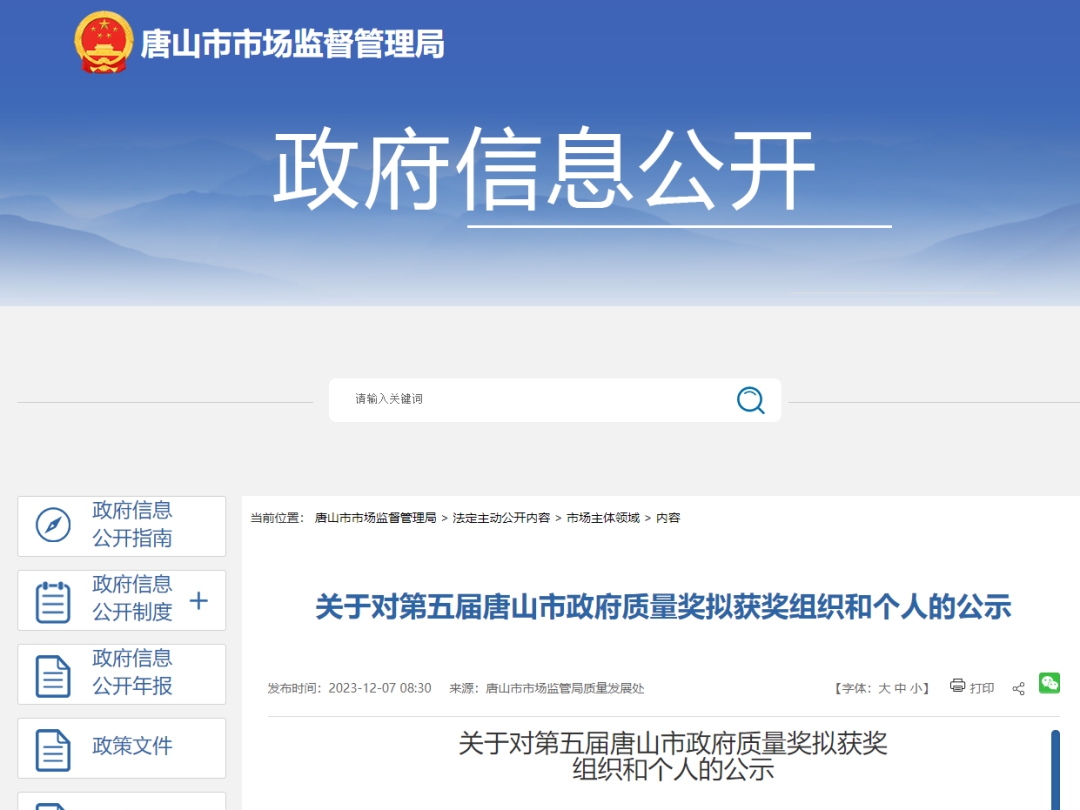 12月7日,中国唐山网站发布了《关于对第五届唐山市政府质量奖拟获奖组织和个人的公示》,其中,涉及6个组织和5个个人,详情如下:
