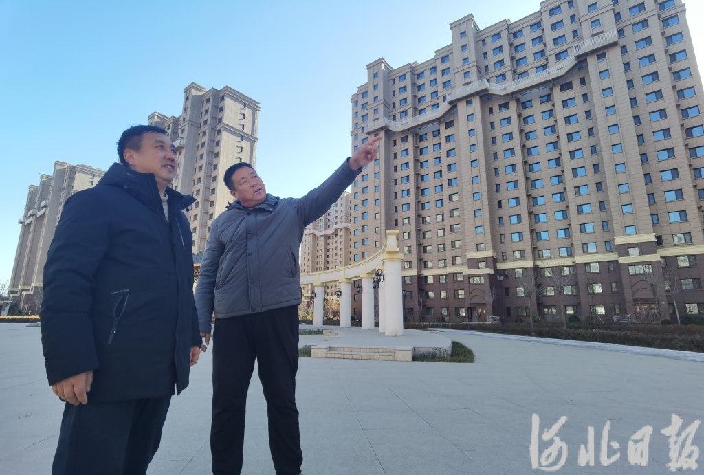 12月1日,唐山海港经济开发区王滩镇曹庄村村民刘锡双(左)和同村村民一起,参观将要入住的湖林景苑小区。河北日报记者王育民摄