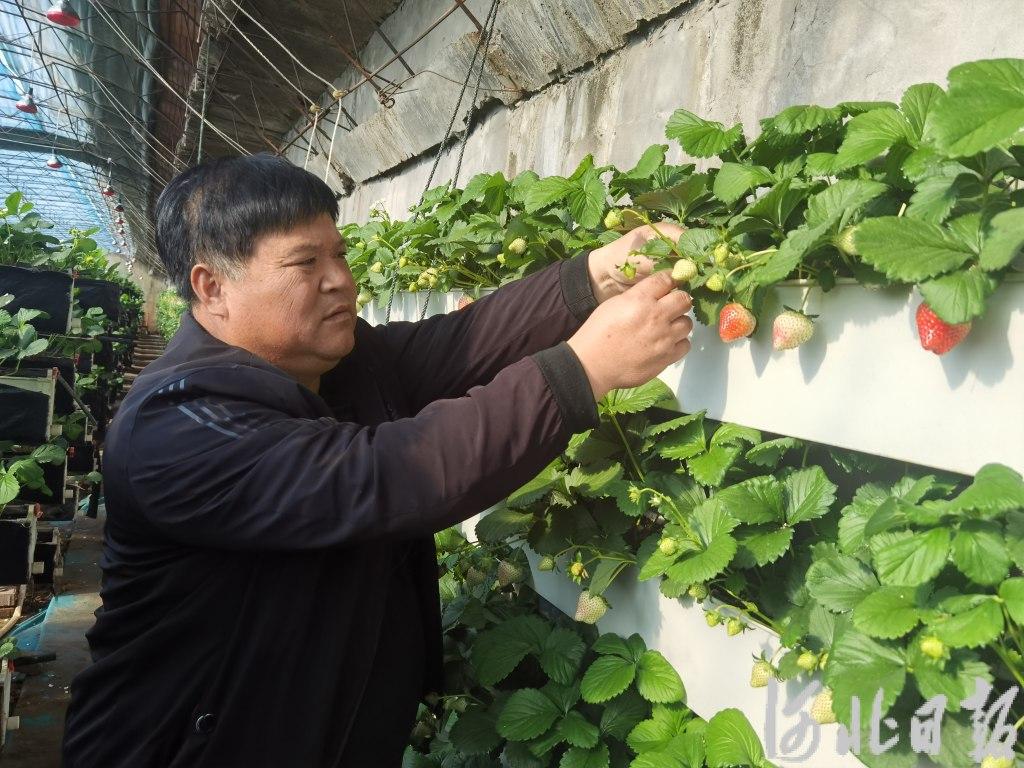 12月4日,在位于迁安市滨河街道任官营村的乐丫生态文化产业园,迁安乐丫实业股份有限公司园艺部经理徐刚在大棚里进行草莓管护。河北日报记者王育民摄