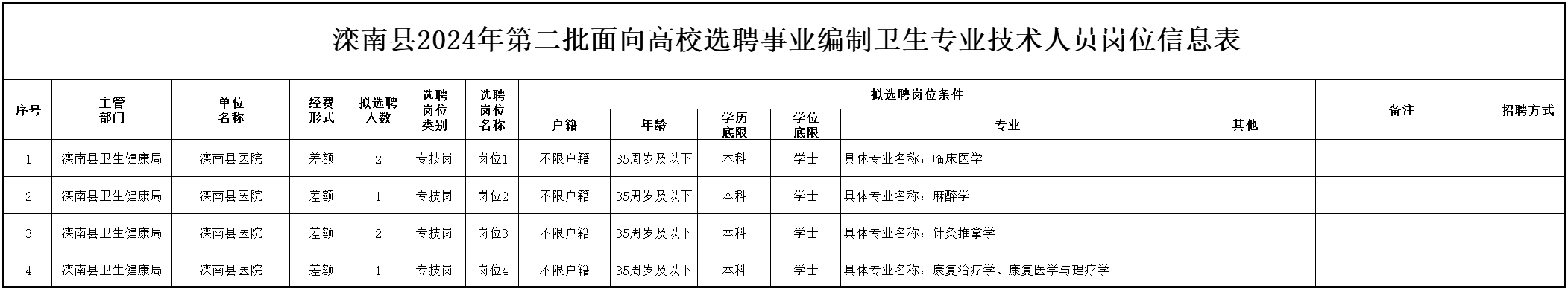 本次选聘事业编制医疗卫生专业技术人员6名。详见《滦南县2024年第二批面向高校选聘事业编制卫生专业技术人员岗位信息表》,以下简称《岗位信息表》。根据各岗位报名情况及选聘进展可动态调整选聘数额,经选聘仍未满额岗位纳入县统一公开招聘计划。