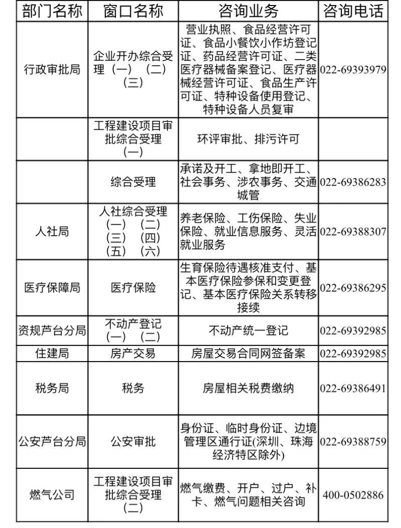 为方便企业、群众办事,芦台区政务服务中心面向社会公布各窗口最新咨询电话、工作时间、办事地点。