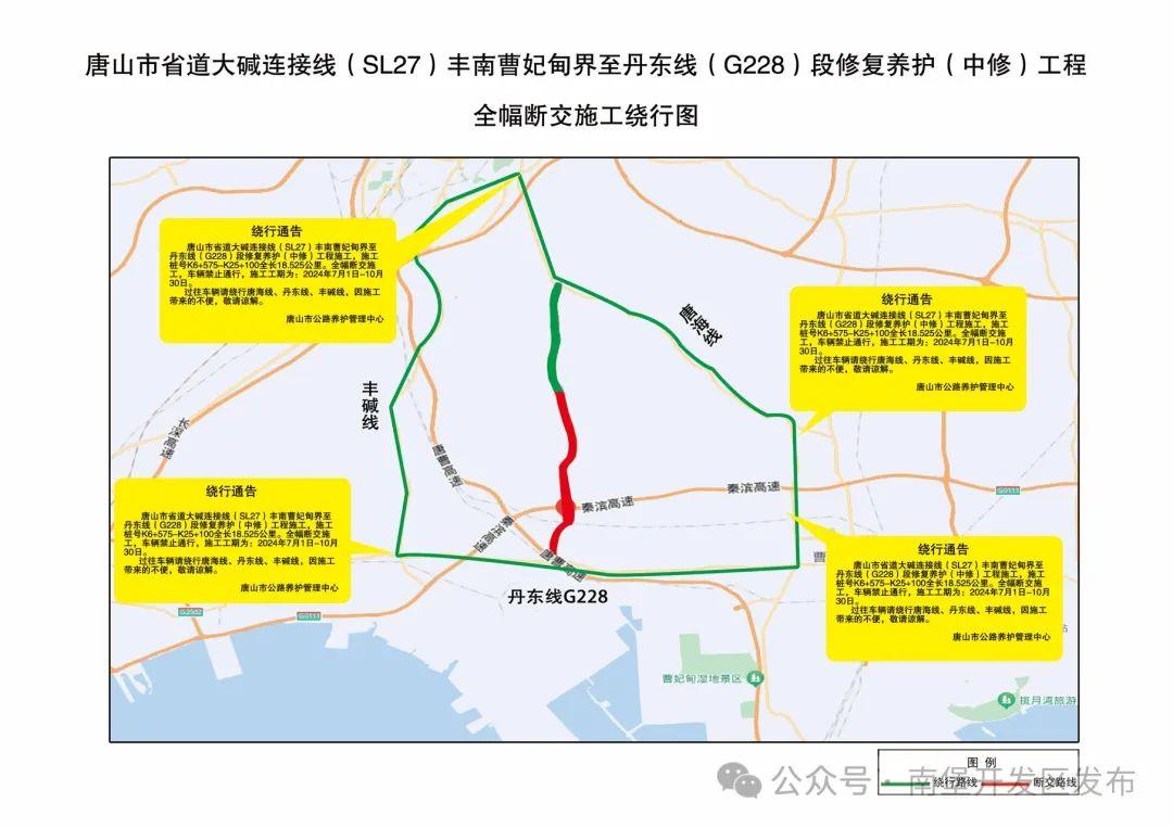 唐山市省道大碱连接线(SL27)丰南曹妃甸界至丹东线(G228)段修复养护(中修)工程(起讫点桩号K6+575-K25+100),路线全长18.525公里。全幅断交施工。过往车辆请绕行:唐海线、丹东线、丰碱线。计划施工日期2024年7月5日-10月31日。