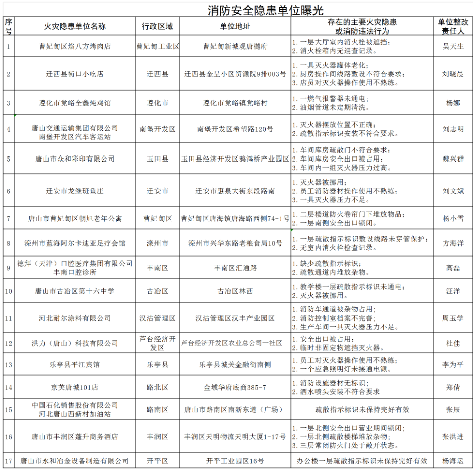为进一步推动火灾隐患整改,强化社会和舆论监督,唐山市消防部门对存在消防安全隐患的下列单位(场所)进行集中曝光。请相关单位立即整改火灾隐患,请广大社会单位自觉落实消防安全主体责任。