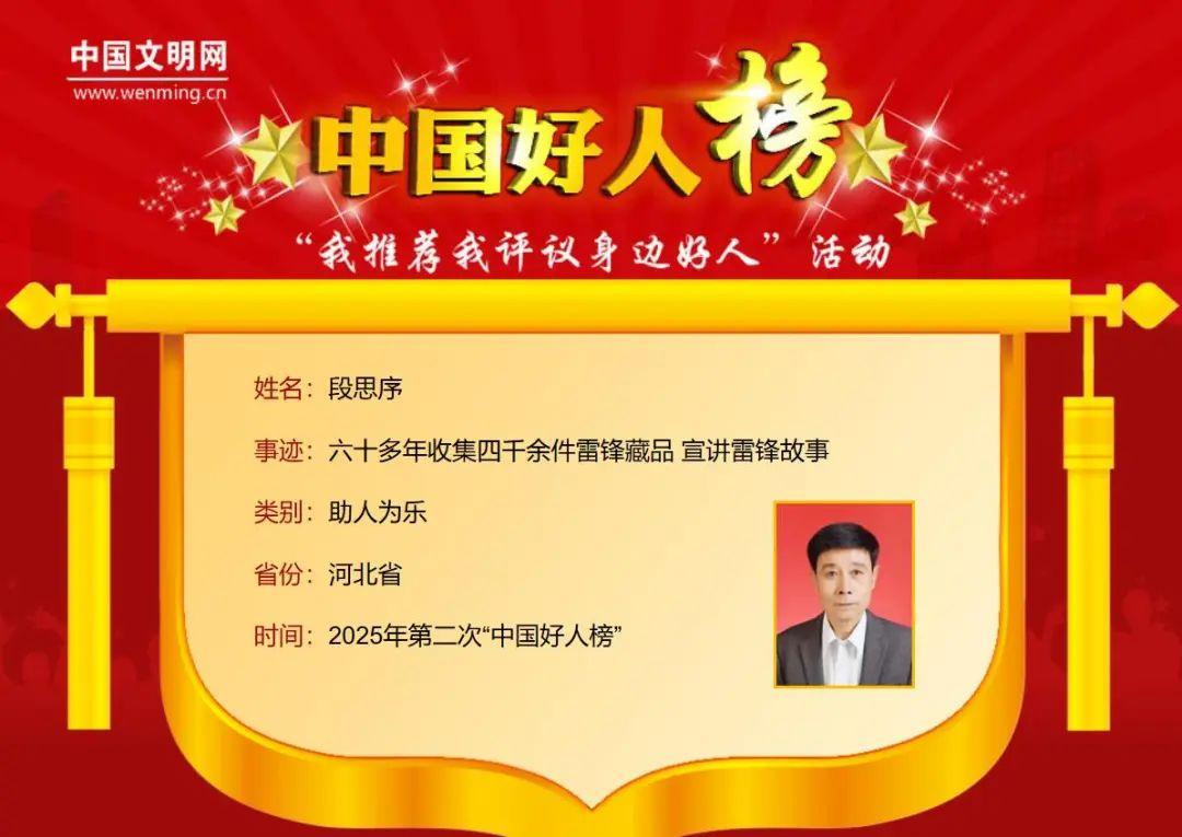 8月27日,2025年第二次“中国好人榜”发布仪式暨全国道德模范与身边好人现场交流活动在黑龙江省伊春市举办。经各地推荐、网友评议和专家评审等环节,共有150人(组)助人为乐、见义勇为、诚实守信、敬业奉献、孝老爱亲身边好人光荣上榜。其中,河北省共有5人上榜,唐山段思序榜上有名。