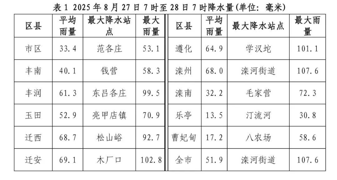 受冷暖空气影响,27日白天到夜间,我市出现强降水天气,中北部大雨到暴雨,个别点大暴雨,南部中到大雨。27日7时-28日7时,全市大暴雨站5个,暴雨站207个,大雨站105个,中雨站46个,小雨站7个,平均降水量为51.9毫米,最大降水量为滦州滦河街道107.6毫米,最大小时雨强为滦州滦河街道58.0毫米/小时。市区及各县区降水量统计见表1。