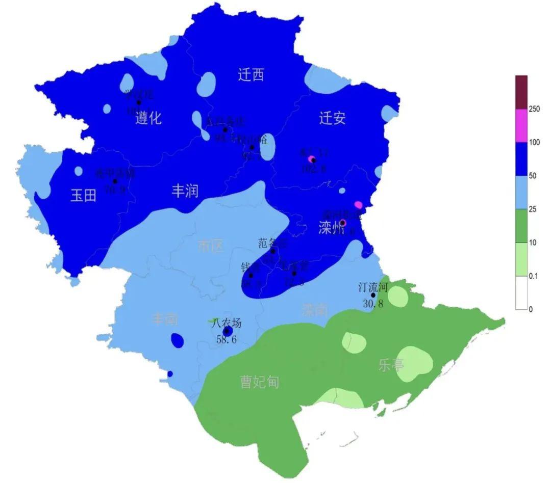 唐山市降雨量实况分布图