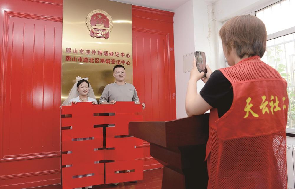 图为天云社会服务中心的志愿者为新人义务拍照。记者 杜雯拓 摄
