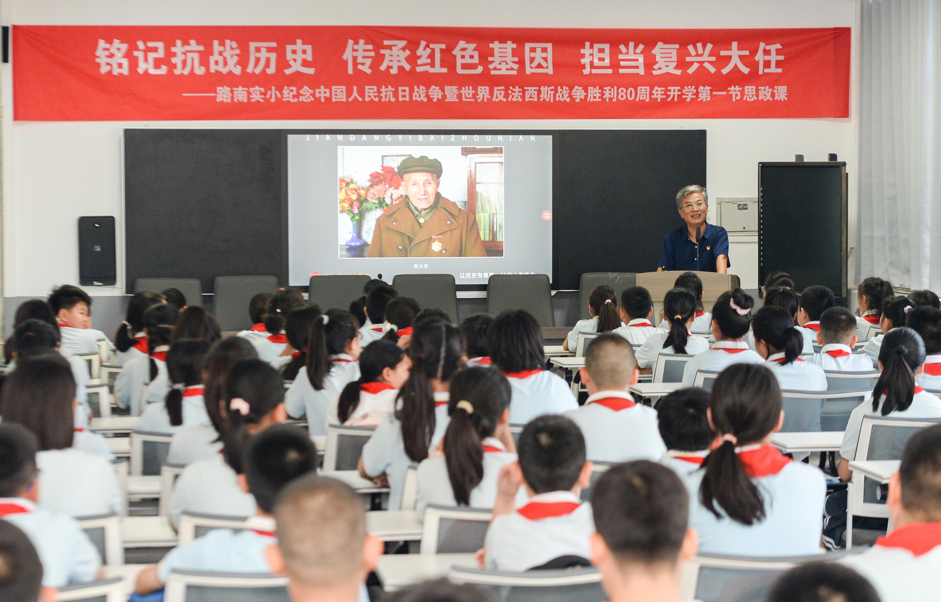 近日,路南区实验小学以纪念中国人民抗日战争暨世界反法西斯战争胜利80周年为主题的“铭记抗战历史 传承红色基因 担当复兴大任”开学第一课开讲。特邀公益摄影师、唐山学院特聘教授戚辉担任主讲人。戚辉以“永不褪色的记忆”公益项目为线索,通过一幅幅珍贵的历史照片和一个个真实的抗战故事,生动讲述了冀东八路军老战士的革命经历与忠诚信念。他深情并茂的讲述,让红色历史从书本走入现实,深深打动了在场师生。此次活动不仅是一堂深刻的爱国主义教育课,更是一次精神的洗礼。它让红色基因渗进血脉、浸入心扉,引导少先队员树立远大理想,传承奋斗精神,筑牢忠诚之魂。