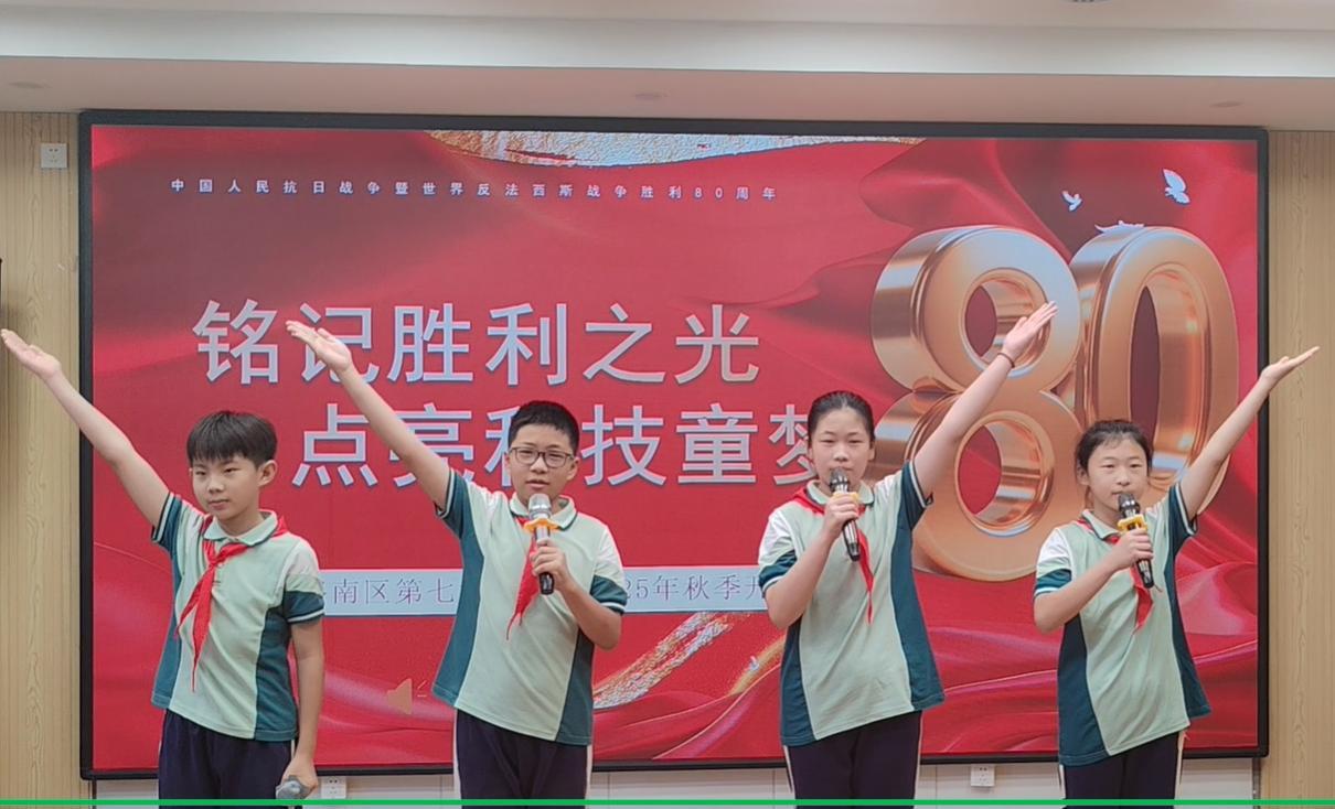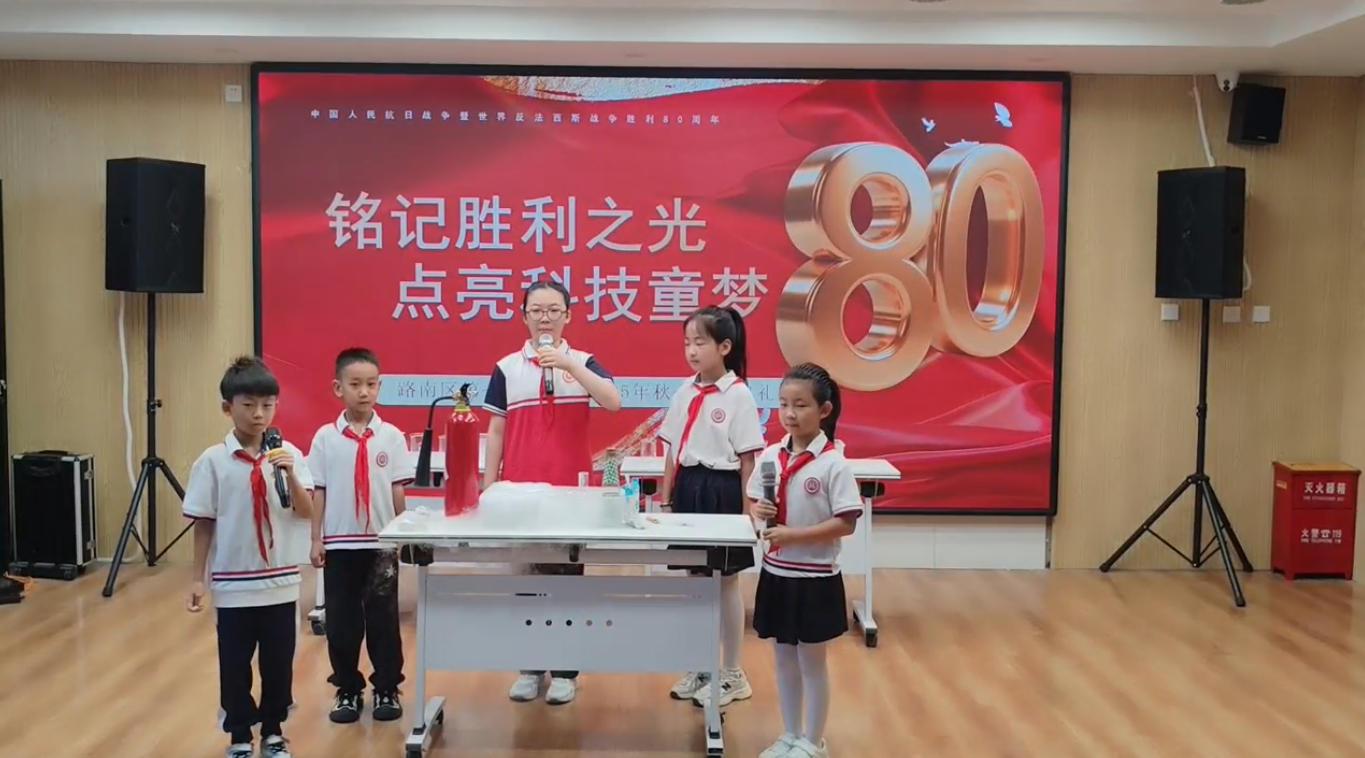 开学典礼通过融合历史与科技教育,激励师生铭记历史、传承精神、树立科技报国理想。活动现场,学生朗诵《民族的丰碑》,深情讴歌了中华民族不屈不挠的抗战精神。科技秀《寻找隐形英雄》,标志着学校科普月活动正式启动,让学生们感受到科技的魅力与力量,激发其探索科学奥秘的兴趣与热情。典礼上,学校对“优秀少先队员”“优秀中队”进行表彰,激励全体学生以先进为榜样,争做新时代的好少年。