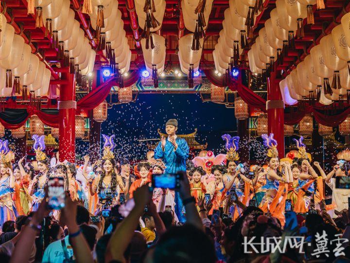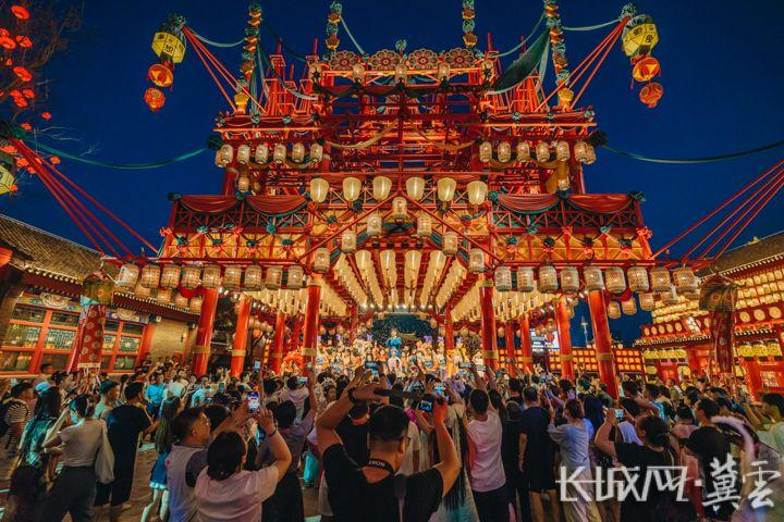 游客们正在河头老街大唐百戏节演出现场拍照留念。