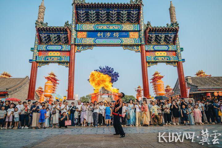 河头老街大唐百戏节以“中国传统百戏艺术”为主题,打造全天候、全覆盖的演艺矩阵。580余名专业演员倾情出演,每天上千场演绎,累计完成近4万场演出,涵盖100多种不同的表演类型,其中20余种非遗表演每天上百场,彰显民俗文化与非遗文化的底蕴和魅力。值得一提的是百戏节期间大型实景演出《唐王东征》累计演出130场,吸引观众36万人次,再现大唐盛世气象。