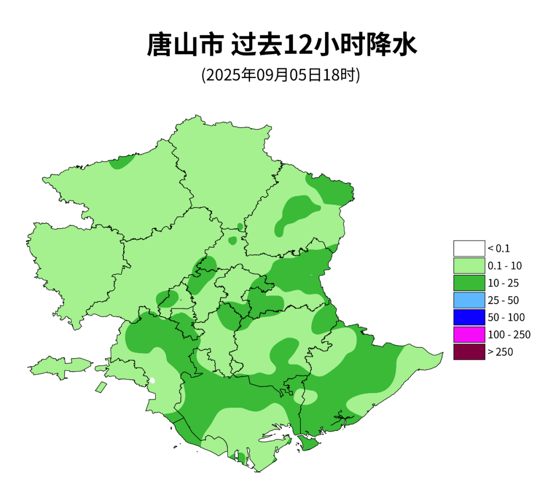 过去12小时唐山全域普降秋雨,共378个监测站记录到有效降水。北部山区雨势较为温和,其中遵化市3.7毫米,迁西县5.0毫米,迁安市则达到10.8毫米中雨量级。中部地区普遍录得5-6毫米降水,值得关注的是滦州市出现16.5毫米明显降水,丰润区与丰南区也在6毫米左右。