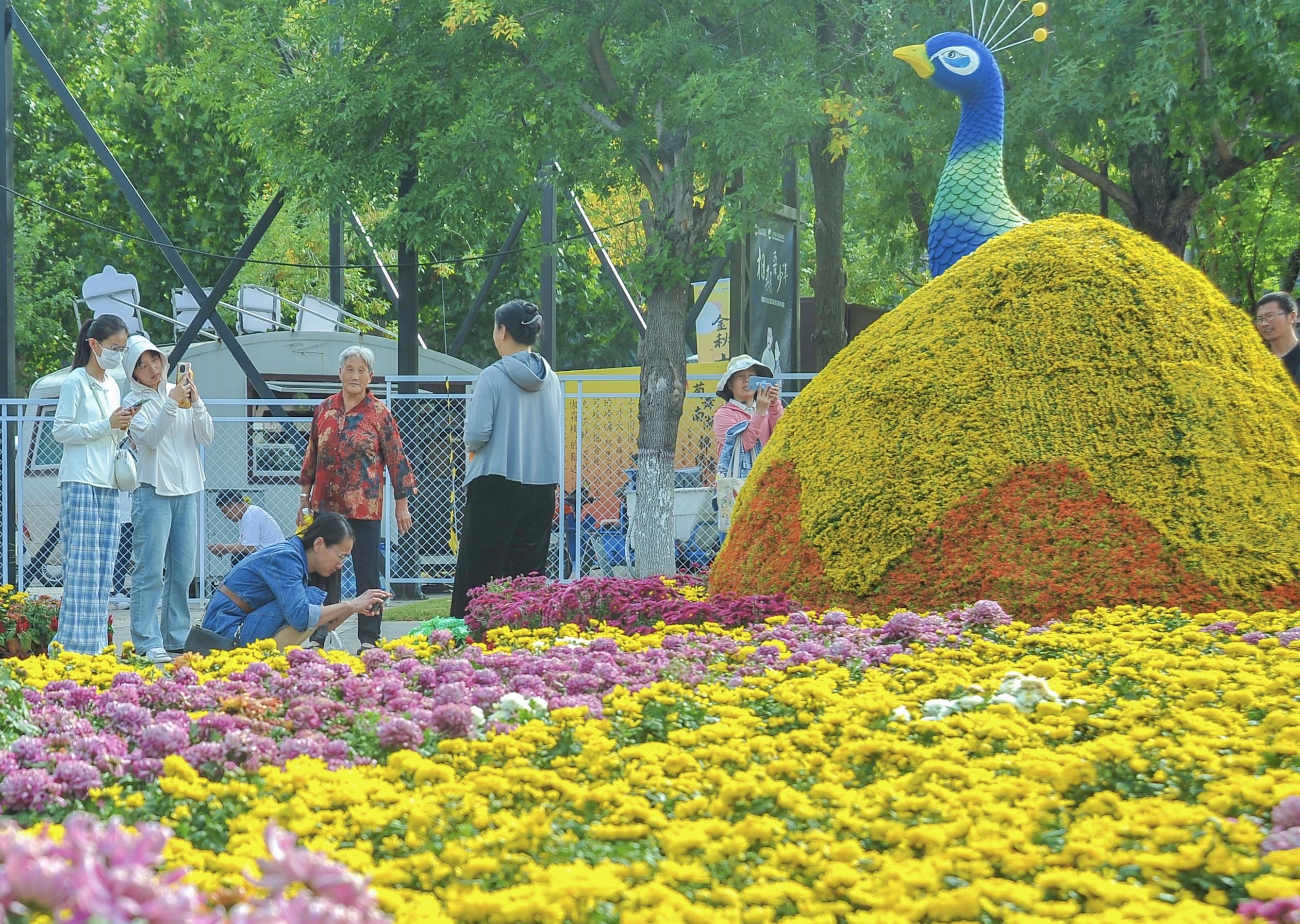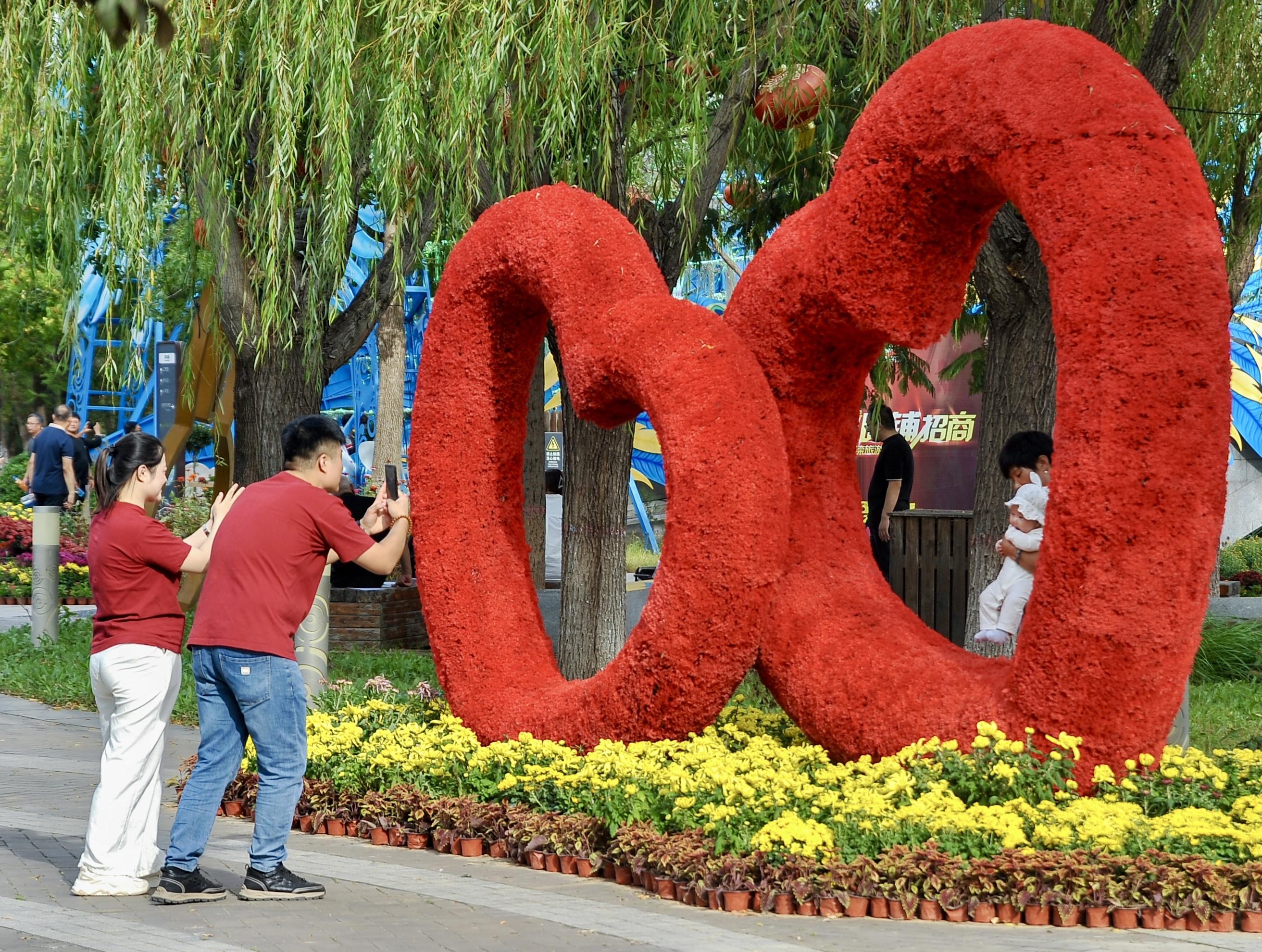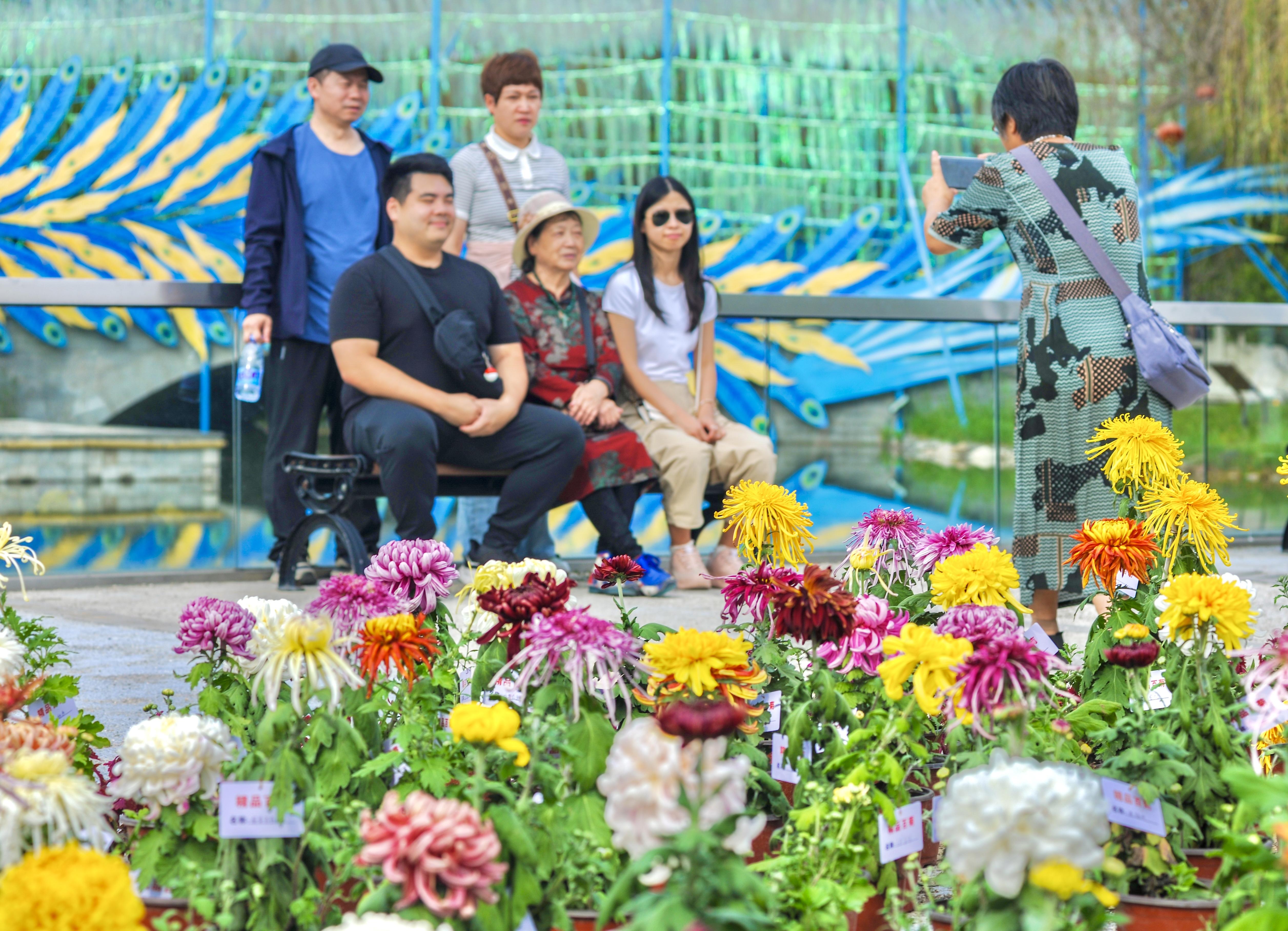 颜色各异的菊花与南湖之景相映成趣,游客或驻足赏花,或与菊景同框,手机、相机不停定格美景。游客郭女士表示:“既能赏菊又能感受唐山文化,这趟假期游很值。”