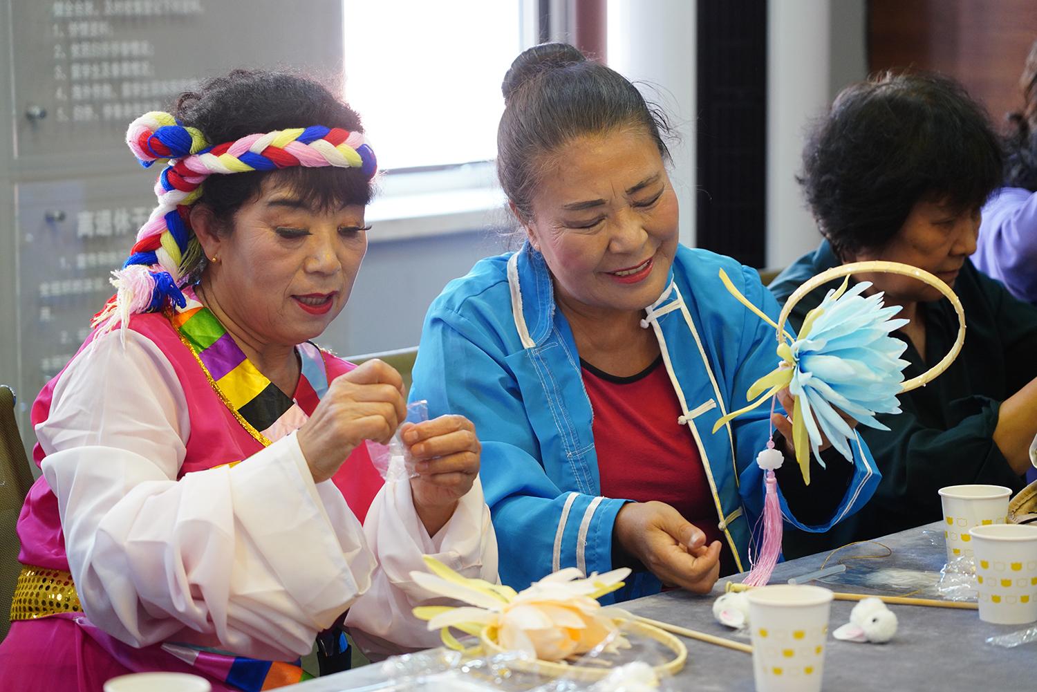 图为社区工作人员与居民共同制作花灯。
