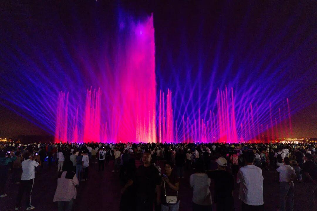 与此同时,光影水舞秀璀璨绽放,水柱随着音乐的节奏翩翩起舞,灯光与水影交织出梦幻般的画面,点亮南湖秋夜。桃花潭区域湖上电音节、桃花潭音乐会同步开唱,为观众带来独特的视听盛宴。