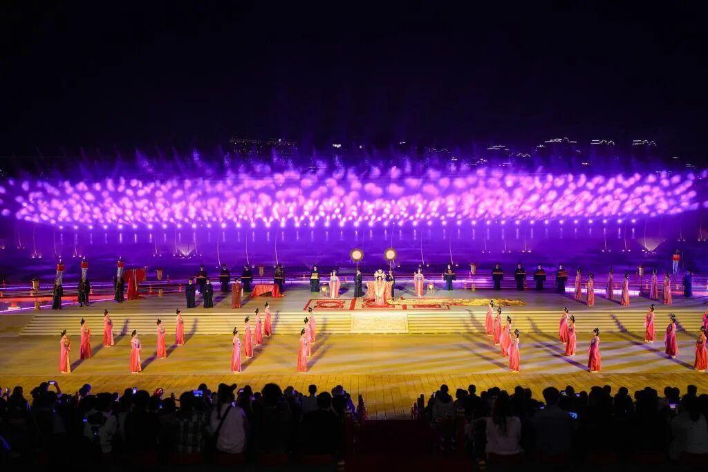 《大唐曹妃》演出的舞台设计堪称“视觉奇观”——依托惠丰湖天然水域打造的真实水景舞台,将水幕投影、水上喷泉与实景布景完美融合。当剧情推进到“册封曹妃”篇章时,水幕突然“炸开”,多彩灯光洒满湖面,配合恢宏的唐乐,瞬间将现场氛围推向高潮。演出不仅融入唐乐歌舞、宫廷礼仪、民间杂技、市井生活等多种唐代元素,而且巧妙植入皮影、乐亭大鼓等呈现唐山本地特色的非物质文化遗产,让游客在欣赏精彩演出的同时,感受到中华优秀传统文化的魅力。更令人眼前一亮的是,演出过程中,演员间或与观众互动,令游客感觉自己不仅是观看者,更是参与者,仿佛置身于大唐市集之中。