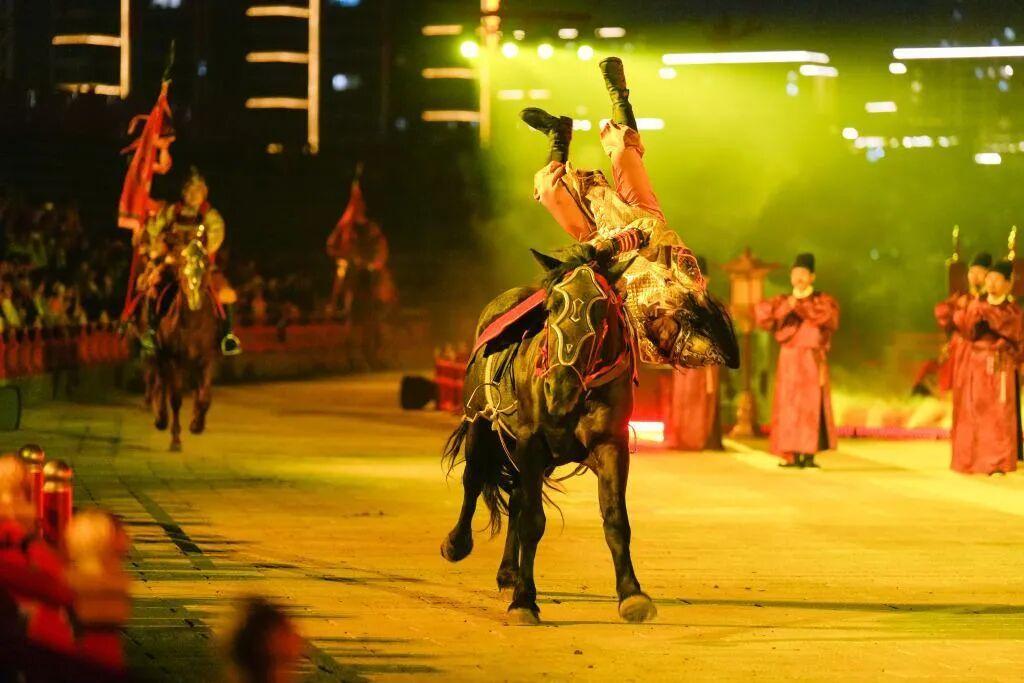 “水幕映着宫殿倒影,演员身着唐装走来,仿佛下一秒就要穿越回贞观年间!”来自天津的游客周女士在观看《大唐曹妃》首演后,难掩激动。这部实景剧以唐太宗李世民东征归来为历史背景,以民间传说中的曹妃故事为主线,展现大唐盛世的繁荣景象和李世民册封曹妃的感人故事。全剧利用现代灯光技术、水幕投影、水上喷泉和实景舞台设计,打造出一场沉浸式的大唐文化体验。观众将随剧情穿越回盛唐时期,亲身感受大唐的雄伟气势与细腻情感。