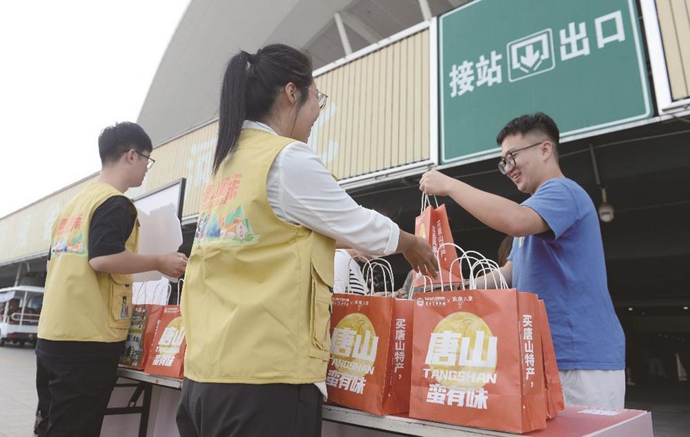 图为唐山文旅集团的工作人员化身“暖心向导”,为每一位抵达唐山的旅客递上一份承载着城市心意的“暖心大礼包”。杜雯拓 摄