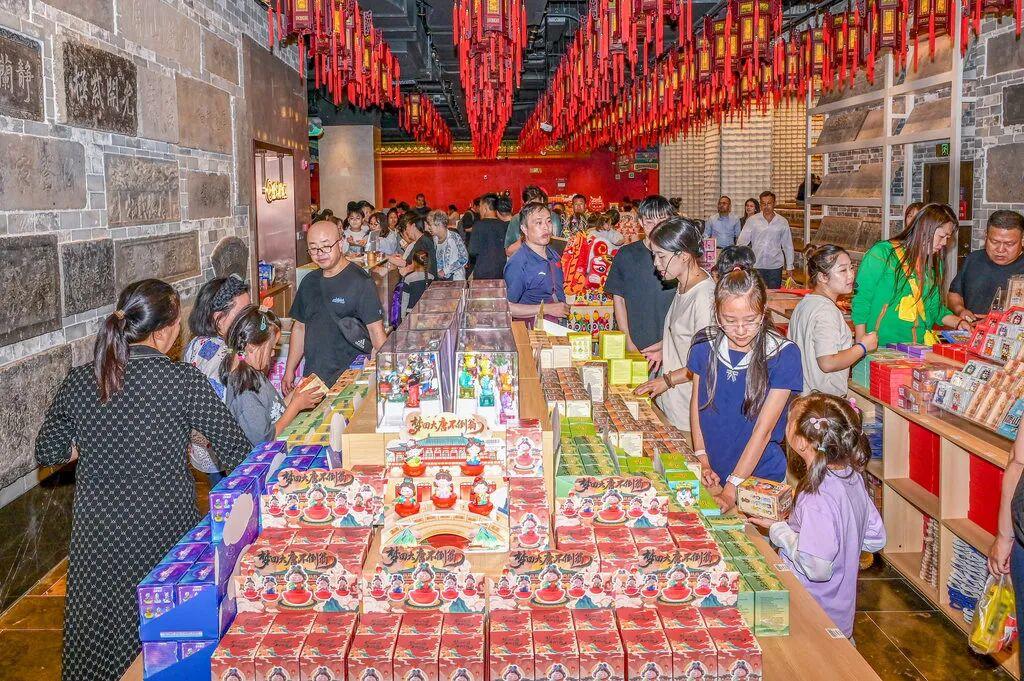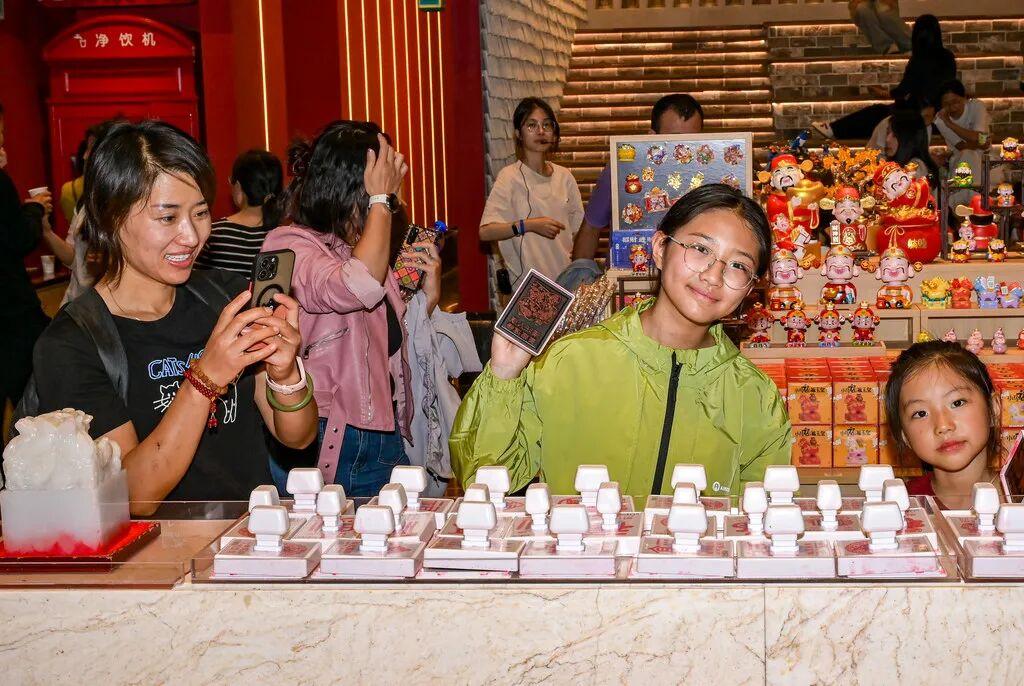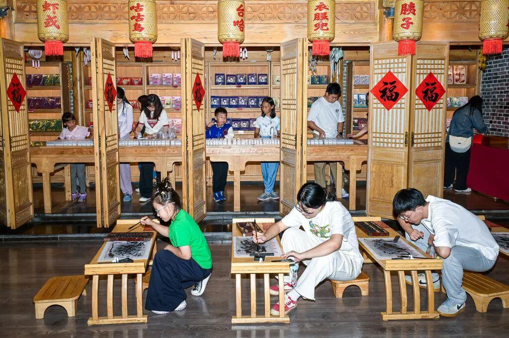 10月1日,唐山宴,游客在体验“笔墨纸砚”。
