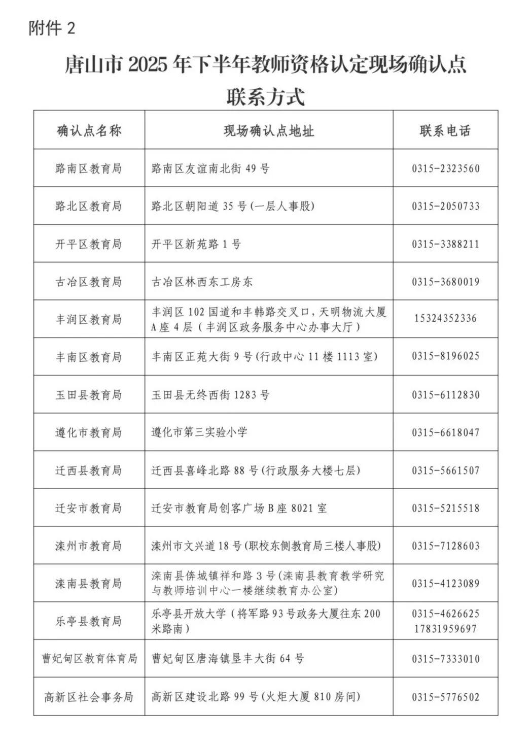 2.唐山市2025年下半年教师资格认定现场确认点联系方式