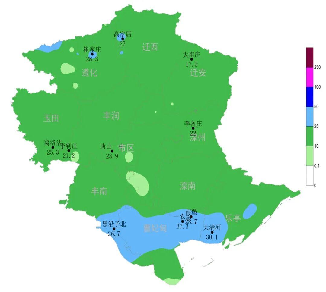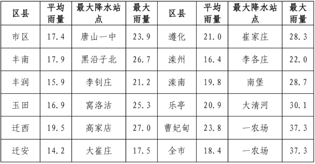 受冷暖空气共同影响,10日白天到夜间,我市再次出现连续性降水,雨量中到大雨。10日7时-11日7时,全市大雨站32个,中雨站331个,小雨站9个,平均降水量为18.4毫米,最大降水量为曹妃甸一农场37.3毫米,最大小时雨强为曹妃甸龙岛8.6毫米/小时。市区及各县区降水量统计见表1。
