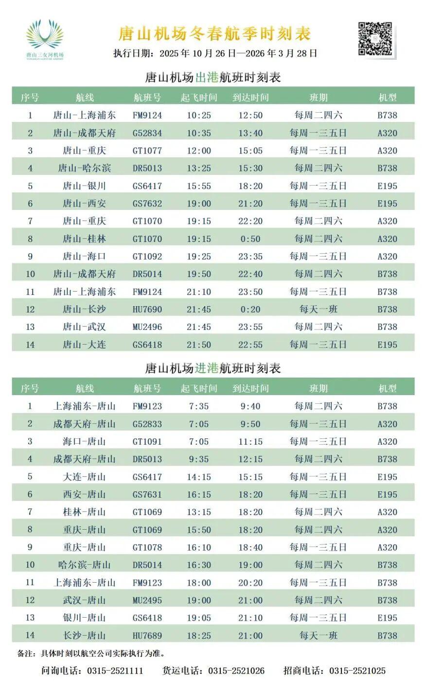 唐山机场自10月26日起执行冬春航季航班计划