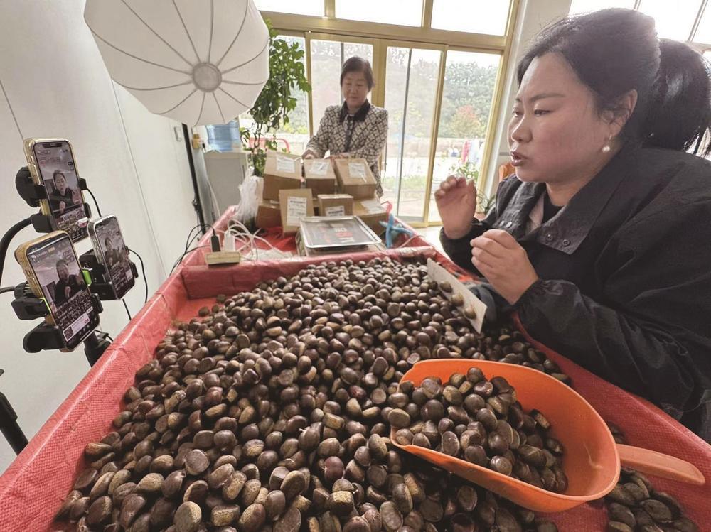 图为付晓静正在直播,通过网络销售板栗。 杜雯拓 摄