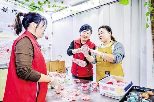 10月9日,耿娟(右二)和队员一起制作喜饼。河北日报记者 赵杰 摄