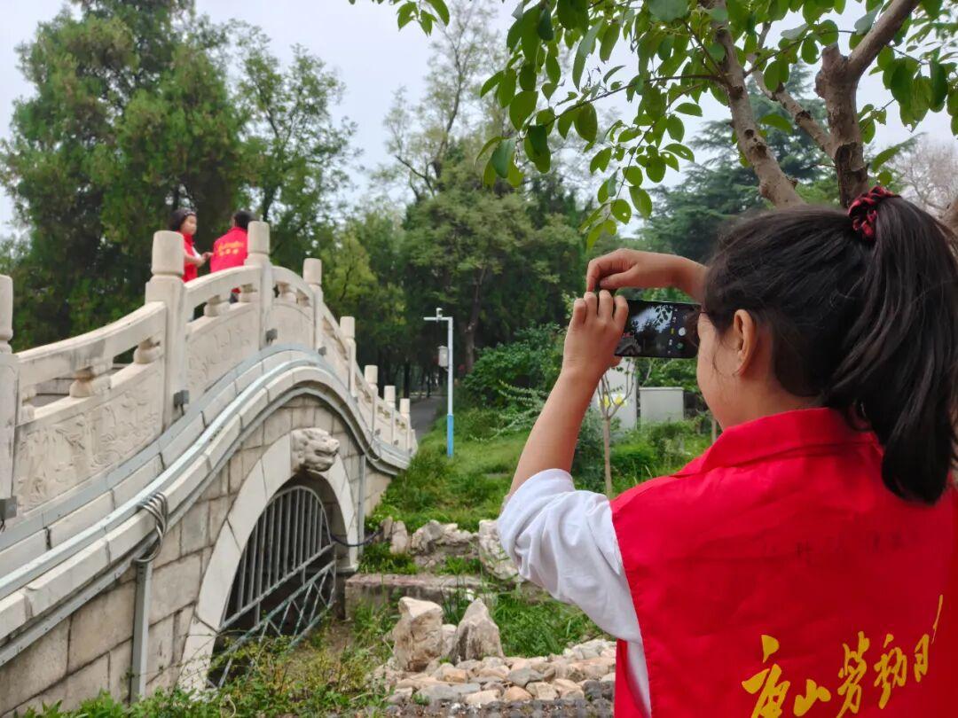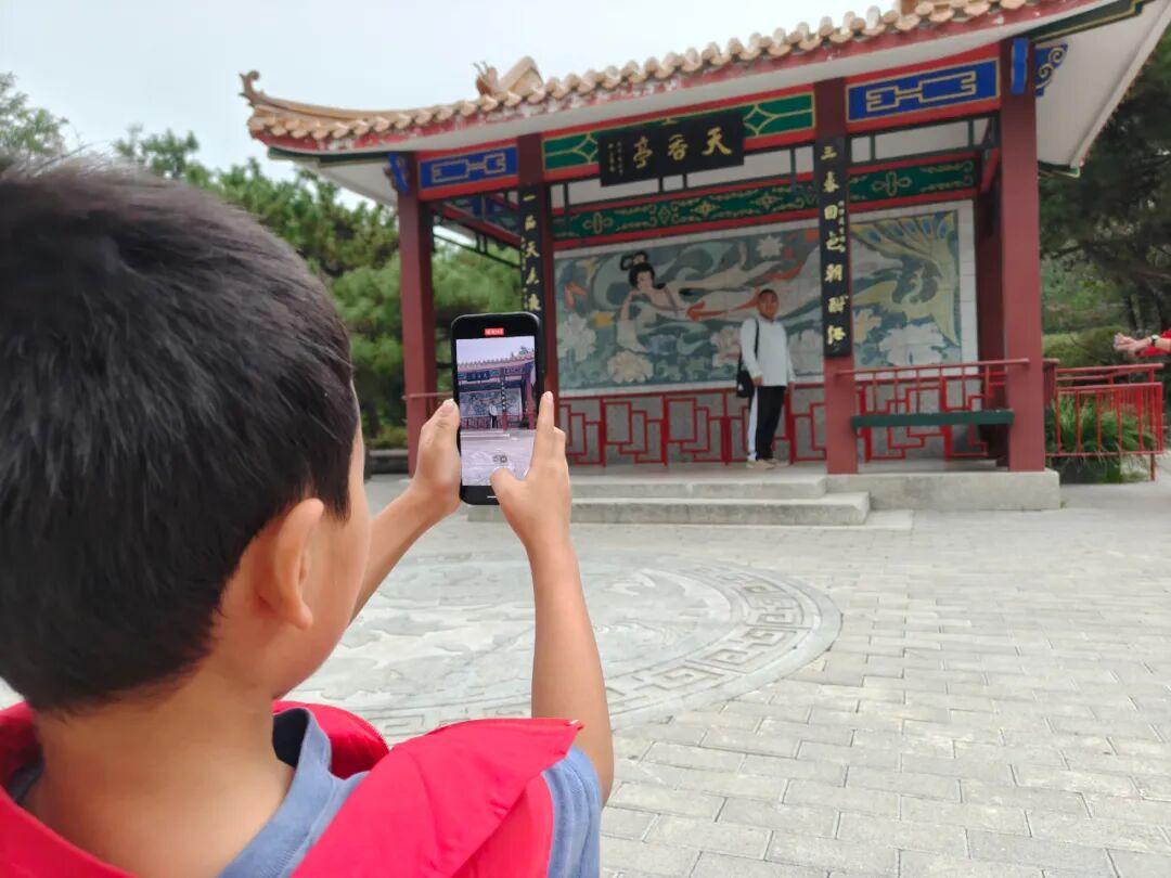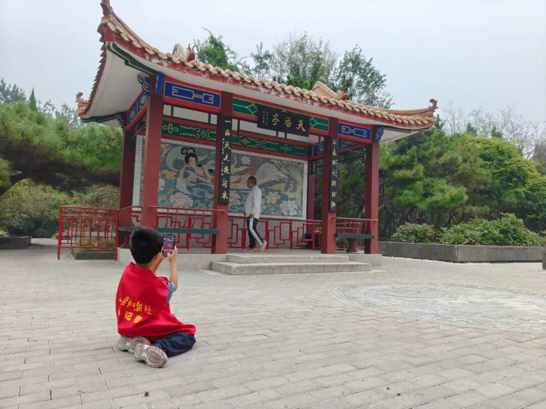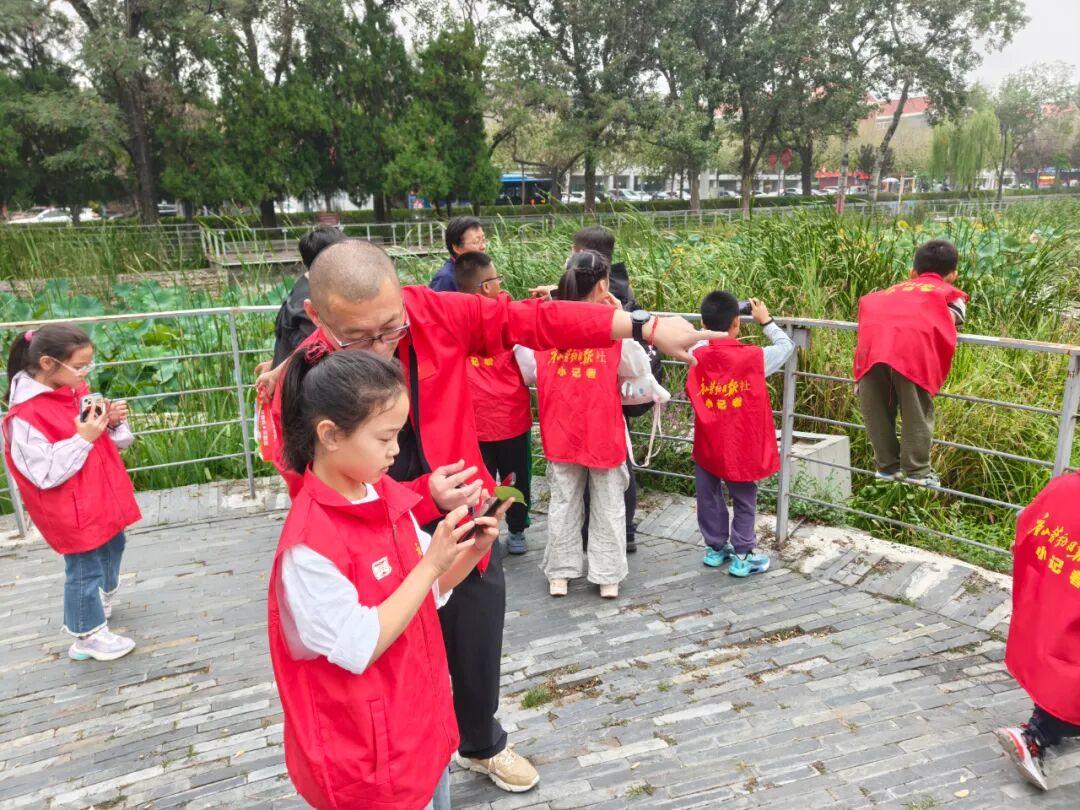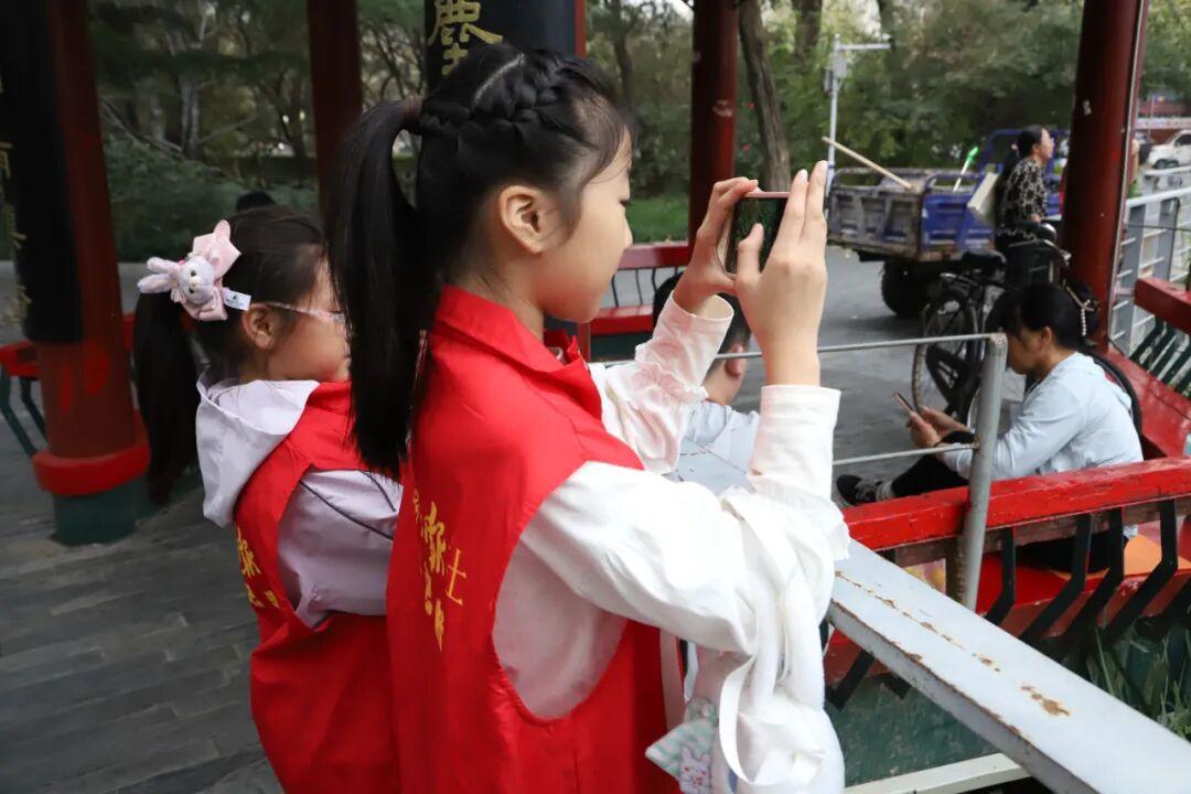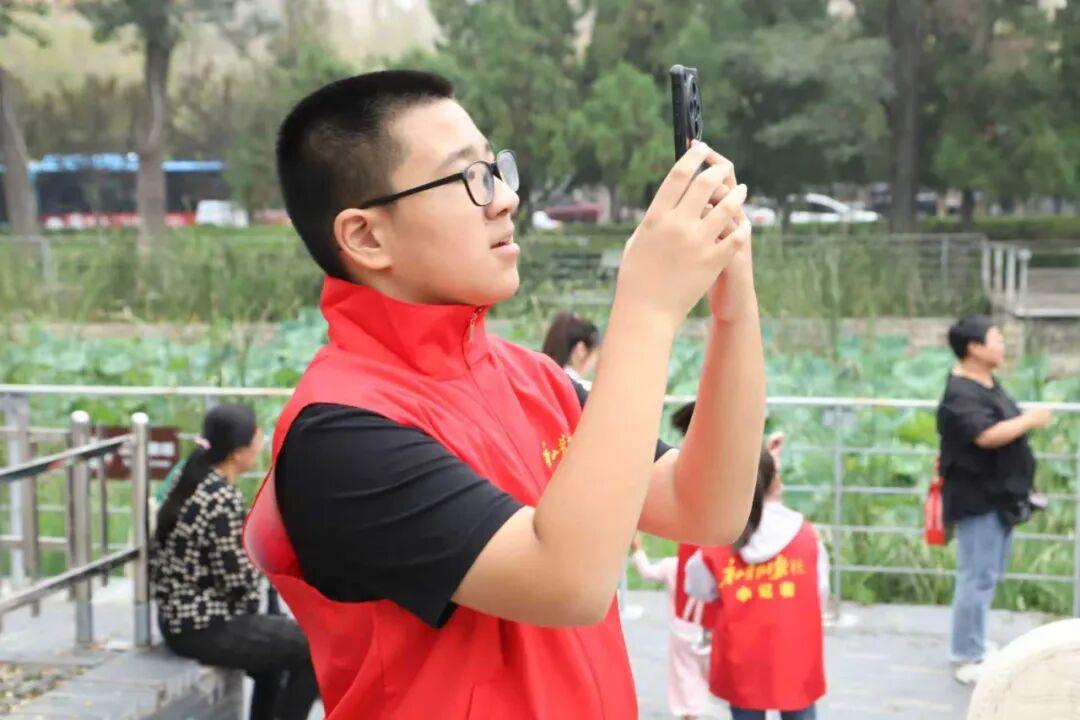 公园荷香湖呈现出一副初秋水岸画卷。荷叶间的一朵粉红荷花、岸边一丛紫红色野花、造型优美的小桥、古色古香的亭子……小记者们发现了一处处美景,并走动着寻找合适的拍摄点,调整手机角度按下快门键。赵亮和王欢两位老师全程指导并不时示范。“根据拍摄场景选择横屏或竖屏,拍荷花尽量避开残叶,拍小桥要确保其完整且在视觉中心。”小记者经过点拨,随着不停的拍摄增长了技艺,许多作品都得到了老师的肯定