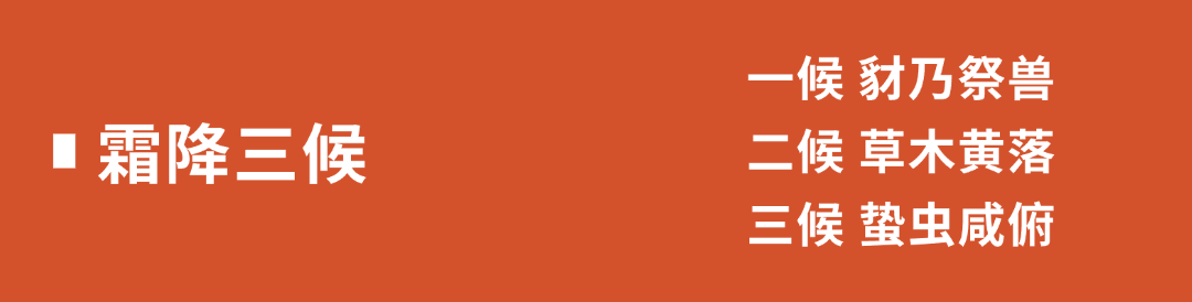 霜降,是秋季的最后一站。“九月中,气肃而凝,露结为霜矣”,天气变冷,露水开始结霜了。“枯草霜花白,寒窗月影新”,在草木枯黄、月朗星稀的夜晚,霜花挂上了窗户,一切都已是暮秋的样子。霜降时节,不仅是柿子经过霜打才会甜熟,能否按照节气变化如约见到寒霜,也事关来年的农业收成。俗语说:“霜降见霜,米谷满仓”,霜降如果不见霜,说明气温相对较高,即将到来的冬天可能是个暖冬,冬天不冷,来年各种害虫就更容易滋生,农作物的收成就会受到影响。