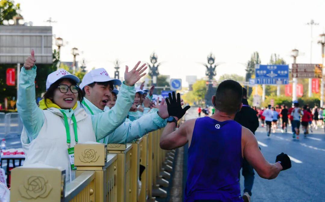 本届唐马沿用经典路线,选手从抗震纪念碑广场出发,途经新华道、建设路等城市主干道,最终跑进南湖生态景区,繁华的都市街景与秀美的湖光山色交相辉映。3000多名来自本地5所高校的志愿者经过系统培训,活跃在物资发放、赛道指引、补给服务等各个岗位。医疗保障方面,组委会构建起“定点+流动”的立体防护网络,救护人员等组成的专业团队全程待命。赛道沿途设置的18个补给站提供充足物资,手持创意加油牌的志愿者与跑者互动,让竞技充满温情。本届唐马还推出了系列特色文创产品,融合评剧、皮影等非遗元素的参赛装备与印有城市地标的冰箱贴等周边,为跑者奉上“唐山记忆”。