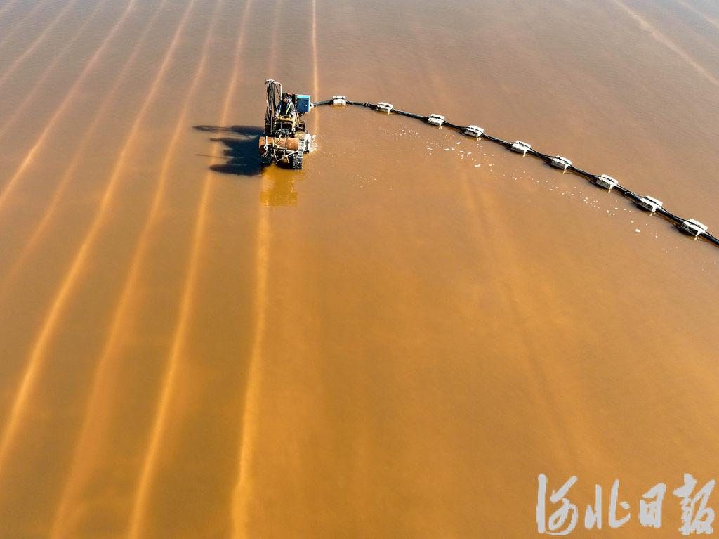 图为在河北省唐山市曹妃甸区南堡盐场,运盐船在运输河道内穿梭行驶。