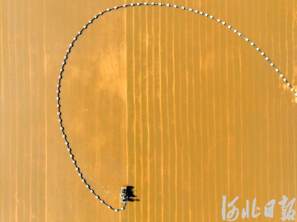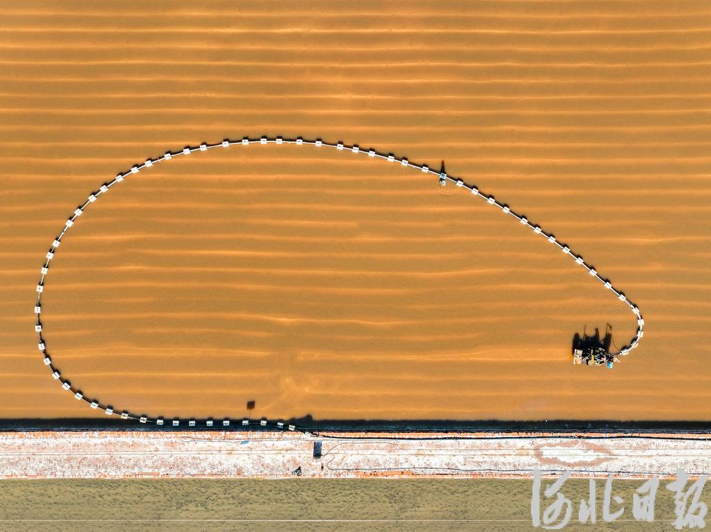 金秋送爽,正值秋盐收获季。10月21日,在河北省唐山市曹妃甸区南堡盐场,工人们利用晴好天气抢收原盐,盐池内一片繁忙“丰景”。