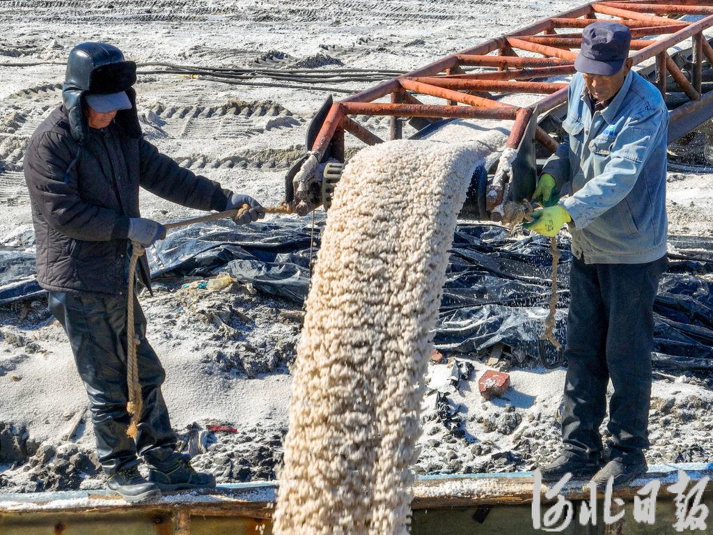 图为在河北省唐山市曹妃甸区南堡盐场,工人们正在进行秋盐装船操作。