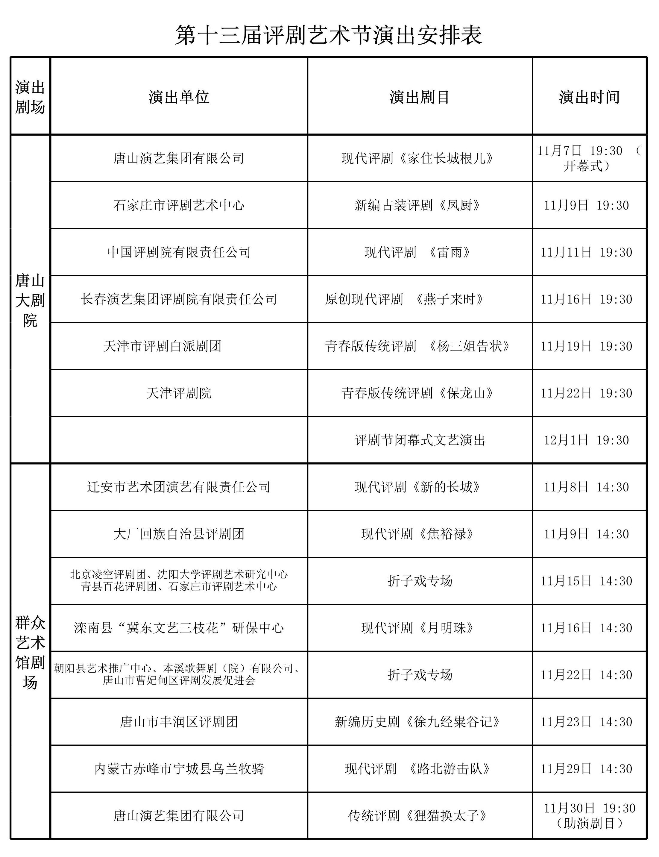 由文化和旅游部艺术司、河北省文化和旅游厅、唐山市人民政府共同主办的评剧艺术节,自2000年开始,至今已经成功举办了十二届。本届评剧艺术节共有5项活动,分别是:开幕式、全国优秀剧目展演、县(市、区)配套活动、千场评剧经典影片放映、闭幕式。开幕式定于2025年11月7日晚7时30分在唐山大剧院举行。由唐山演艺集团有限公司现代评剧《家住长城根儿》作为开幕式演出剧目。闭幕式定于12月1日晚7时30分在唐山大剧院举行。闭幕式结束后,文华奖、梅花奖获得者冯玉萍、曾昭娟等优秀评剧演员将带来评剧名家名段精彩演出。