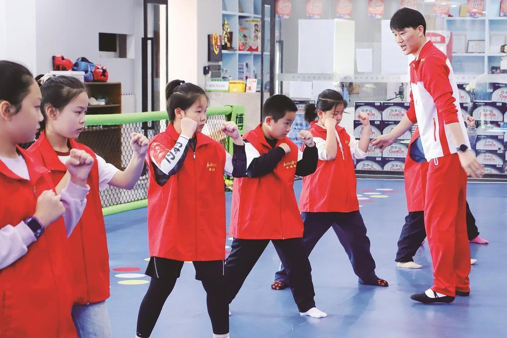 热身环节中,杨文杰带领大家进行关节活动、拉伸和体能训练。压腿、弓步、抱膝跳……小记者们紧跟教练的节奏,尽管都冒了汗,却无人松懈。进入技术教学阶段,教练重点讲解并示范了直拳的基础动作,从站姿、握拳姿势到出拳力度和发力技巧,逐一细致指导。针对小记者们出现的问题,教练耐心地逐一纠正,手把手帮助大家掌握动作要领。小记者们的动作虽显稚嫩,却个个斗志昂扬。最后,在教练的组织下,小记者们分组进行游戏,在你追我赶中放松身心。