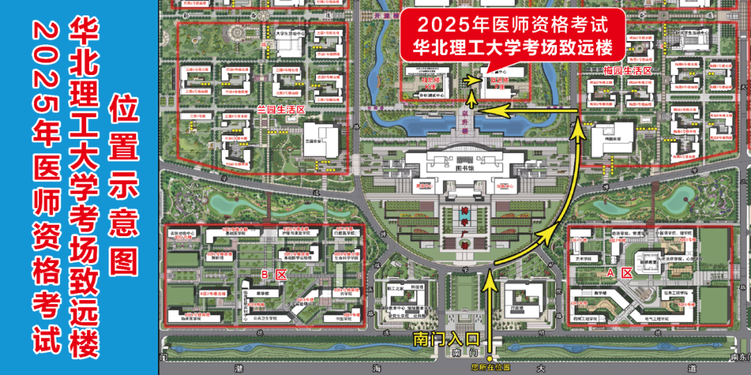 华北理工大学冀唐学院考场由西北门步行进入,直行500米后向南转再行50米即可。
