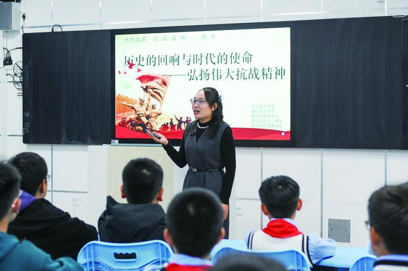 席山十中思政教师羡敬贤引导大家回顾历史。梁宇 摄