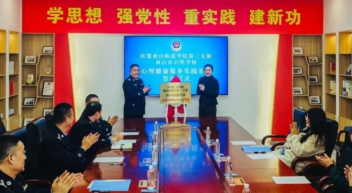 民盟师院二支部主委李艳利和唐山市启明学校校长郭玉春共同为心理健康服务实践基地揭牌。 李颖摄