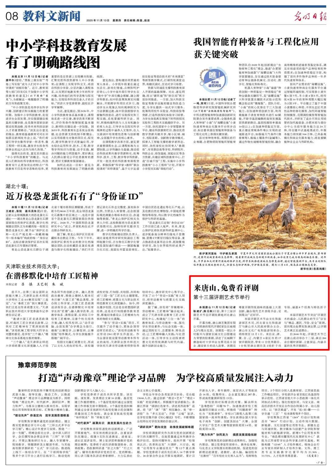 11月13日,《光明日报》刊发报道《来唐山,免费看评剧 第十三届评剧艺术节举行》,详情如下: