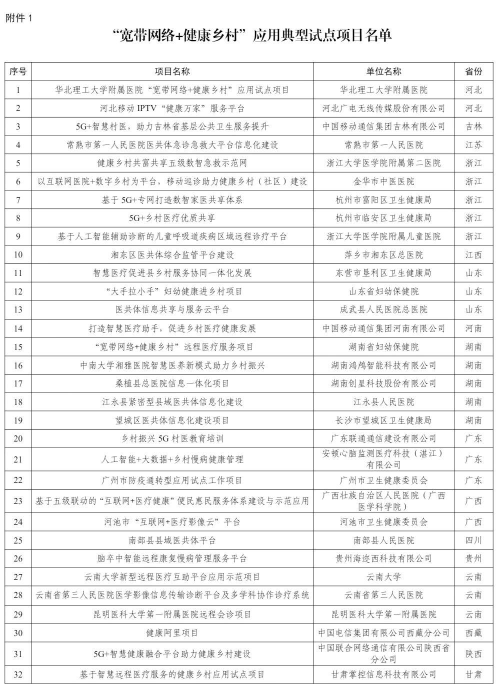 1.“宽带网络+健康乡村”应用典型试点项目名单