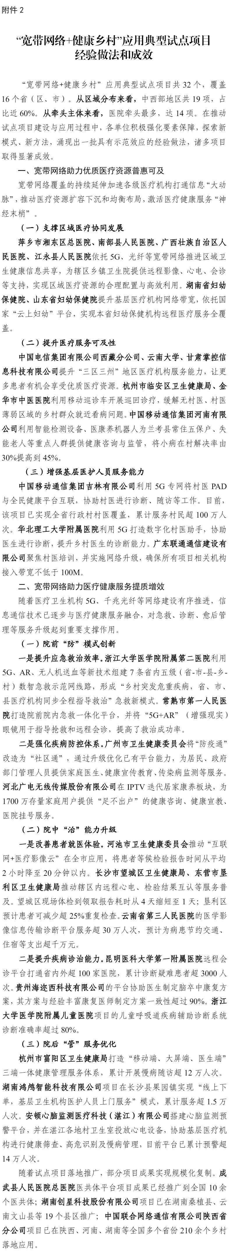 在推动试点项目建设与应用过程中,各单位强化要素保障,推动宽带网络赋能各级医疗机构打通信息“大动脉”,促进医疗资源扩容下沉和均衡布局,加快5G、千兆光网等高质量网络逐步与医疗健康服务融合,对急救、诊断、愈后管理等服务升级起到重要支撑作用,涌现出一批具有示范效应的经验做法(见附件2)。请各地通信管理局、工业和信息化主管部门、卫生健康主管部门结合试点项目经验做法,加大宣传推广力度,拓展“宽带网络+健康乡村”应用场景,充分发挥农村地区宽带网络建设成效,持续提升农村地区卫生健康服务能力。